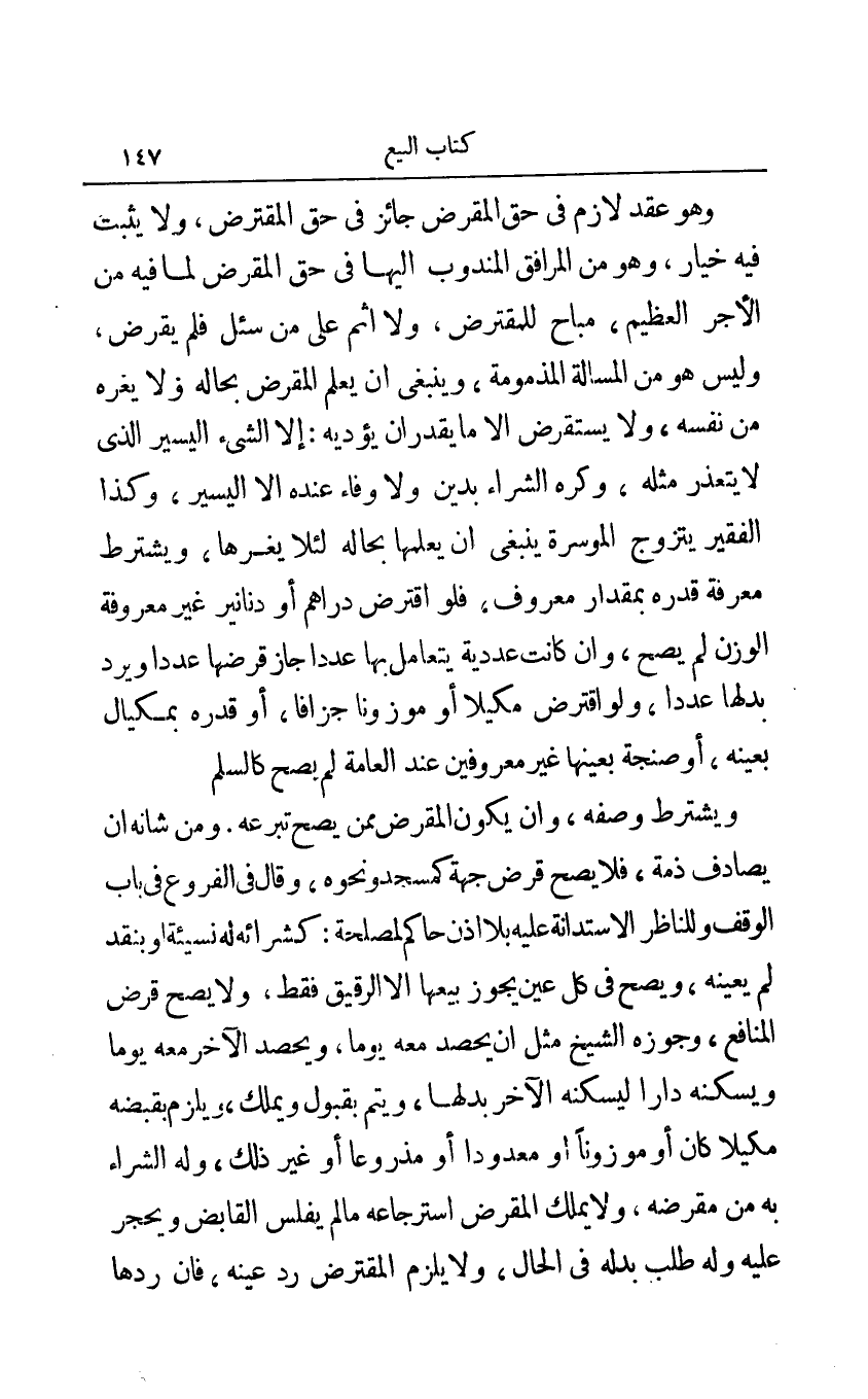 وهو عقد لازم في حق المقرض جائز في حق المقترض ولا يثبت فيه خيار وهو المرافق المندوب إليها في حق المقرض لما فيه من الأجر العظيم مباح للمتقرض ولا أثم على من سئل فلم يقرض وليس هو من المسألة المذمومة وينبغي أن يعلم المقرض بحاله ولا يغره من نفسه ولا يستقرض إلا ما يقدر أن يؤديه: إلا الشيء اليسير الذي لا يتعذر مثله وكره الشراء بدين ولا وفاء عنده إلا اليسير وكذا الفقير يتزوج الموسرة ينبغي أن يعلمها بحاله لئلا يغرها ويشترط معرفة قدره بمقدار معروف فلو اقترض دراهم أو دنانير غير معروفة الوزن لم يصح وإن كانت عددية يتعامل بها عددا جاز قرضها عددا ويرد بدلها عددا ولو اقترض مكيلا أو موزنا جزافا أو قدره بمكيال بعينه أو صنجة بعينها غير معروفين عند العامة لم يصح كالسلم.