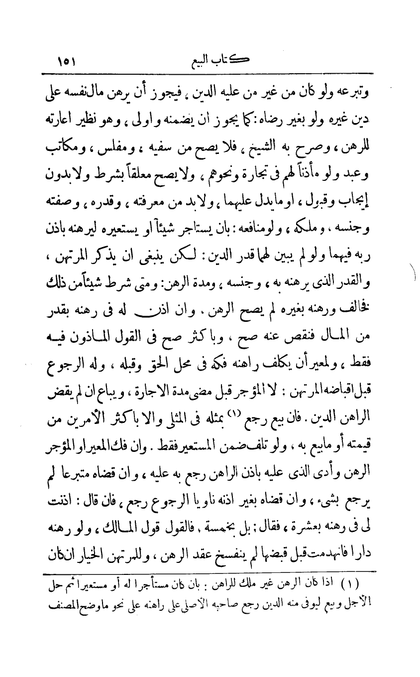 وتبرعه ولو كان من غير من عليه الدين فيجوز أن يرهن مال نفسه على دين غيره ولو بغير رضاه: كما يجوز أن يضمنه وأولى وهو نظير إعارته للرهن وصرح به الشيخ فلا يصح من سفيه ومفلس ومكاتب وعبد ولو مأذونا لهم في تجارة ونحوهم ولا يصح معلقا بشرط ولا بدون إيجاب وقبول أو ما يدل عليهما ولا بد من معرفته وقدره وصفته وجنسه وملكه ولو منافعه: بأن يستأجر شيئا أو يستعير ليرهنه بإذن ربه فيهما ولو لم يبين لهما قدر الدين: لكن ينبغي أن يذكر المرتهن والقدر الذي يرهنه به وجنسه ومدة الرهن: ومتى شرط شيئا من ذلك فخالف ورهنه بغيره لم يصح الرهن وإن أذن له في رهنه بقدر من المال فنقص عنه صح وبأكثر صح في القول المأذون فيه فقط ولمعير أن يكلف راهنه فكه في محل الحق وقبله وله الرجوع قبل إقباضه المرتهن: لا المؤجر قبل مضي مدة الإجارة ويباع إن لم يقض الراهن الدين فإن بيع رجع1 بمثله في المثلى وإلا بأكثر الأمرين من قيمته أو ما بيع به ولو تلف ضمن المستعير فقط. وإن فك المعير أو المؤجر الرهن وأدى الذي عليه بإذن الراهن رجع به عليه وإن قضاه متبرعا لم يرجع بشيء وإن قضاه بغير إذنه ناويا الرجوع رجع فإن قال: أذنت لي في رهنه بعشرة فقال بل بخمسة فالقول قول المالك ولو رهنه دارا فانهدمت قبل قبضها لم ينفسخ عقد الرهن وللمرتهن الخيار إن كان
