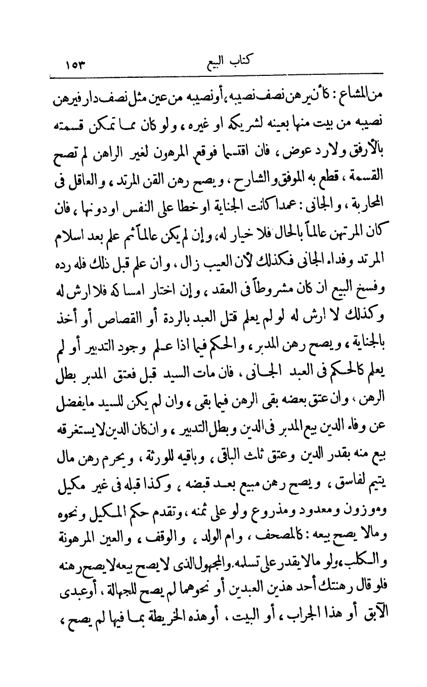 من المشاع: كأن يرهن نصف نصيبه أو نصيبه من عين مثل نصف دار فيرهن نصيبه من بيت منها بعينه لشريكه أو غيره ولو كان مما تمكن قسمته بالأرفق ولا رد عوض فإن اقتسما فوقع المرهون لغير الراهن لم تصح القسمة قطع به الموفق والشارح ويصح رهن القن المرتد والعاقل في المحاربة والجاني: عمدا كانت الجناية أو خطأ على النفس أو دونها فإن كان المرتهن عالما بالحال فلا خيار له وإن لم يكن عالما ثم علم بعد إسلام المرتد وفداء الجاني فكذلك لأن العيب زال وإن علم قبل ذلك فله رده وفسخ البيع إن كان مشروطا في العقد وإن اختار إمساكه فلا أرش له وكذل لا أرش له لو لم يعلم قتل العبد بالردة أو القصاص أو أخذ بالجناية ويصح رهن المدبر والحكم فيما إذا علم وجود التدبير أو لم يعلم كالحكم في العبد الجاني فإن مات السيد قبل المدبر بطل الرهن وإن عتق بعضه بقي الرهن فيما بقي وإن لم يكن للسيد ما يفضل عن وفاء الدين بيع المدبر في الدين وبطل التدبير وإن كان الدين لا يستغرقه بيع منه بقدر الدين وعتق ثلث الباقي وباقيه للورثة ويحرم رهن مال يتيم لفاسق ويصح رهن مبيع بعد قبضه وكذا قبله في غير مكيل وموزون ومعدود ومذروع ولو على ثمنه وتقدم حكم المكيل ونحوه وما لا يصح بيعه: كالمصحف وأم الولد والوقف والعين المرهونة والكلب ولو ما لا يقدر على تسلمه والمجهول الذي لا يصح بيعه لا يصح رهنه فلو قال رهنتك أحد هذين العبدين أو نحوهما لم يصح للجهالة أو عبدي الآبق أو هذا الجراب أو البيت أو هذه الخريطة بما فيها لم يصح،