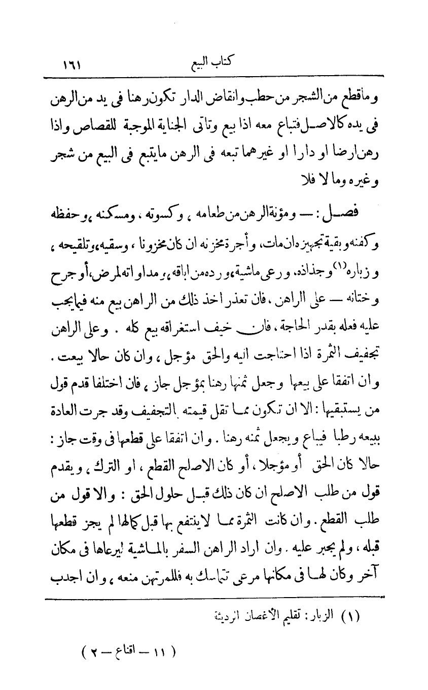 وكسوته ومسكنه وحفظه وكفنه وبقية تجهيزه أن مات وأجرة مخزنه إن كان مخزونا وسقيه وتلقيحه وزباره1 وجذاذه ورعي ماشية ورده من إباقه ومداواته لمرض أو جرح وختانه - على الراهن فإن تعذر أخذ ذلك من الراهن بيع منه فيما يجب عليه فعله بقدر الحاجة فإن خيف استغراقه بيع كله وعلى الراهن تجفيف الثمرة إذا احتاجت إليه والحق مؤجل وإن كان حالا بيعت وإن اتفقا على بيعها وجعل ثمنها رهنا بمؤجل جاز فإن اختلفا قدم قول من يستبقيها: إلا أن تكون مما تقل قيمته بالتجفيف وقد جرت العادة ببيعه رطبا فيباع ويجعل ثمنه رهنا وإن اتفقا على قطعها في وقت جاز: حالا كان الحق أو مؤجلا أو كان الأصلح القطع أو الترك ويقدم قول من طلب الأصلح إن كان ذلك قبل حلول الحق: وإلا قول من طلب القطع وإن كانت الثمرة مما لا ينتفع بها قبل كمالها لم يجز قطعها قبله ولم يجبر عليه وإن أراد الراهن السفر بالماشية ليرعاها في مكان آخر وكان لها في مكانها مرعى تتماسك به فللمرتهن منعه وإن أجدب