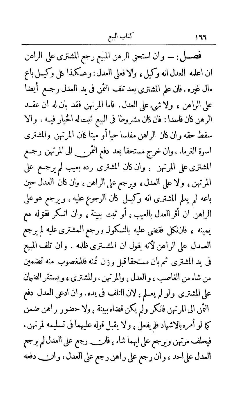 رجع المشتري على الراهن أن أعلمه العدل أنه وكيل وإلا فعلى العدل: وهكذا كل وكيل باع ما ل غيره فإن علم المشتري بعد تلف الثمن في يد العدل رجع أيضا على الراهن ولا شيء على العدل فأما المرتهن فقد بان له أن عقد الرهن كان فاسدا: فإن كان مشروطا في البيع ثبت له الخيار فيه وإلا سقط حقه وإن كان الراهن مفلسا حيا أو ميتا كان المرتهن والمشتري أسوة الغرماء وإن خرج مستحقا بعد دفع الثمن إلى المرتهن رجع المشتري على المرتهن وإن كان المشتري رده بعيب لم يرجع على المرتهن ولا على العدل ويرجع على الراهن وإن كان العدل حين باعه لم يعلم المشتري أنه وكيل كان الرجوع عليه ويرجع هو على الراهن إن أقر العدل بالعيب أو ثبت ببينة وإن أنكر فقوله مع يمينه فإن نكل فقضي عليه بالنكول ورجع المشتري عليه لم يرجع العدل على الراهن لأنه يقول أن المشتري ظلمه وإن تلف المبيع في يد المشتري ثم بان مستحقا قبل وزن ثمنه فللمغصوب منه تضمين من شاء من الغاصب والعدل والمرتهن والمشتري ويستقر الضمان على المشتري ولو لم يعلم لأن التلف في يده وإن ادعى العدل دفع الثمن إلى المرتهن فأنكر ولم يكن قضاه ببينة ولا حضور راهن ضمن كما لو أمره بالأشهاد فلم يفعل ولا يقبل قوله عليهما في تسليمه لمرتهن فيحلف مرتهن ويرجع على أيهما شاء فإن رجع على العدل لم يرجع العدل على أحد وإن رجع على راهن رجع على العدل وإن دفعه