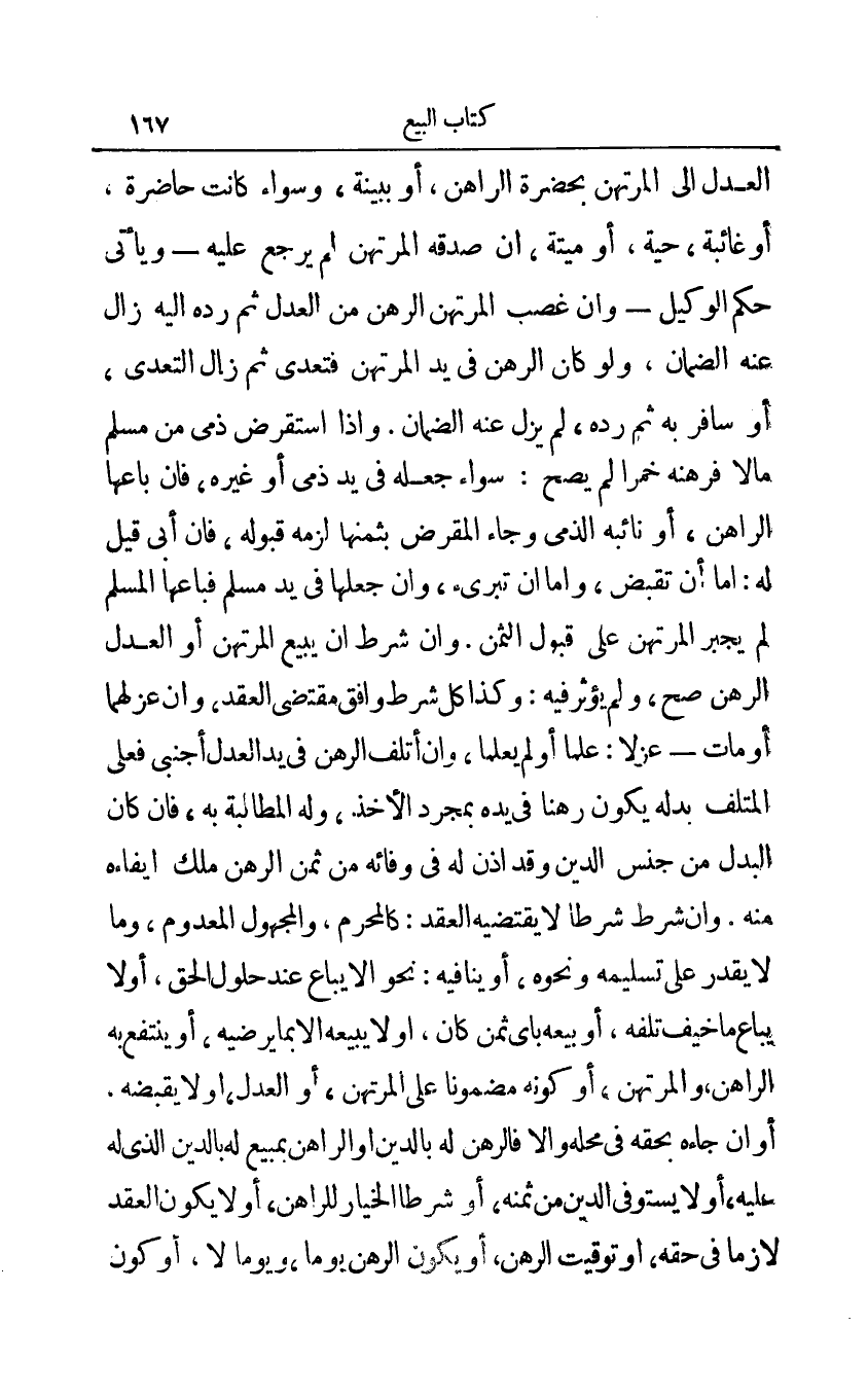 العدل إلى المرتهن بحضرة الراهن أو ببينة وسواء كانت حاضرة أو غائبة حية أو ميتة إن صدقه المرتهن لم يرجع عليه - ويأتي حكم الوكيل - وإن غصب المرتهن الرهن من العدل ثم رده إليه زال عنه الضمان ولو كان الرهن في يد المرتهن فتعدى ثم زال التعدى أو سافر به ثم رده لم يزل عنه الضمان وإذا استقرض ذمي من مسلم مالا فرهنه خمرا لم يصح: سواء جعله في يد ذمي أو غيره فإن باعها الراهن أو نائبه الذمي وجاء المقرض بثمنها لزمه قبوله فإن أبى قيل له: أما أن تقبض وأما أن تبرىء وإن جعلها في يد مسلم فباعها المسلم لم يجبر المرتهن على قبول الثمن وإن شرط أن يبيع المرتهن أو العدل الرهن صح ولم يؤثر فيه: وكذا كل شرط وافق مقتضى العقد وإن عزلهما أو مات - عزلا: علما أولم يعلما وإن أتلف الرهن في يد العدل أجنبي فعلى المتلف بدله يكون رهنا في يده بمجرد الأخذ وله المطالبة به فإن كان البدل من جنس الدين وقد أذن له في وفائه من ثمن الرهن ملك إيفاءه منه وإن شرط شرطا لا يقتضيه العقد: كالمحرم والمجهول المعدوم وما لا يقدر على تسلميه ونحوه أو ينافيه: نحو إلا يباع عند حلول الحق أو لا يباع ما خيف تلفه أو بيعه بأي ثمن كان أو لا يبيعه إلا بما يرضيه أو ينتفع به الراهن والمرتهن أو كونه مضمونا على المرتهن أو العدل أو لا يقبضه إن جاءه بحقه في محله وإلا فالرهن له بالدين أو الراهن بمبيع له بالدين الذي له عليه أو لا يستوفي الدين من ثمنه أو شرطا الخيار للراهن أو لا يكون العقد لازما في حقه أو توقيت الرهن أو يكون الرهن يومأ ويوما لا أو كون
