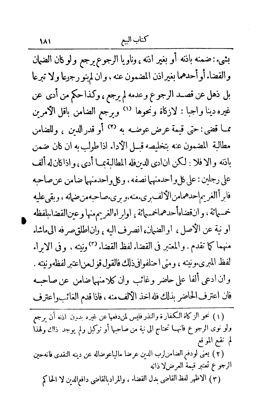 ضمنه بأذنه أو بغير أذنه وناويا الرجوع يرجع ولو كان الضمان والقضاء أو أحدهما بغير أذن المضمون عنه وإن لم ينو رجوعا ولا تبرعا بل ذهل عن قصد الرجوع وعدمه لم يرجع وكذا حكم من أدى عن غيره دينا واجبا: لا زكاة ونحوها1 ويرجع الضامن بأقل الأمرين مما قضى: حتى قيمة عرض عرضه به2 أو قدر الدين وللضامن مطالبة المضمون عنه بتخليصه قبل الأداء إذا طولب به إن كان ضمن بإذنه وإلا فلا: لكن إن أدى الدين فله المطالبة بما أدى وإذا كان له ألف على رجلين: على كل واحد منهما نصفه وكل واحد منهما ضامن عن صاحبه فابرأ الغريم أحدهما من الألف بريء منه وبريء صاحبه من ضمانه وبقي عليه خمسمائة وإن قضاه أحدهما خمسمائة أو أبراه الغريم منها وعين القضاء بلفظه أو نية عن الأصل أو الضمان انصرف إليه وإن أطلق صرفه إلى ما شاء منهما كما تقدم والمعتبر في القضاء لفظ القضاء3 ونيته وفي الإبراء لفظ المبريء ونيته ومتى اختلفوا في ذلك فالقول قول من أعتبر لفظه ونيته وإن أدعى ألفا على حاضر وغائب وإن كلا منهما ضامن عن صاحبه فإن اعترف الحاضر بذلك فله أخذ الألف منه فإذا قدم الغائب واعترف