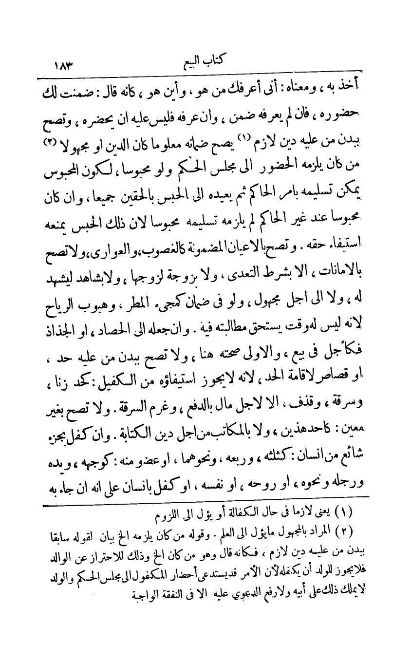 أخذ به ومعناه: أني أعرفك من هو وأين هو كأنه قال: ضمنت لك حضوره فإن لم يعرفه ضمن وإن عرفه فليس عليه أن يحضره وتصح ببدن من عليه دين لازم1 يصح ضمانه معلوما كان الدين أو مجهولا2 من كان يلزمه الحضور إلى مجلس الحكم ولو محبوسا لكون المحبوس يمكن تسليمه بأمر الحاكم ثم يعيده إلى الحبس بالحقين جميعا وإن كان محبوسا عند غير الحاكم لم يلزمه تسليمه محبوسا لأن ذلك الحبس يمنعه استيفاء حقه وتصح بالأعيان المضمونة كالغصوب والعواري ولا تصح بالأمانات إلا بشرط التعدي ولا بزوجة لزوجها ولا بشاهد ليشهد له ولا إلى أجل مجهول ولو في ضمان كمجيء المطر وهبوب الرياح لأنه ليس له وقت يستحق مطالبته فيه وإن جعله إلى الحصاد أو الجذاذ فكأجل في بيع والأولى صحته هنا ولا تصح ببدن من عليه حد أو قصاص لإقامة الحد لأنه لا يجوز استيفاؤه من الكفيل: كحد زنا وسرقة وقذف إلا لأجل مال بالدفع وغرم السرقة ولا تصح بغير معين: كأحد هذين ولا بالمكاتب من أجل دين الكتابة وإن كفل بجزء شائع من إنسان: كثلثه وربعه ونحوهما أو عضو منه: كوجهه ويده ورجله ونحوه أو روحه أو نفسه أو كفل بإنسان على أنه إن جاء به