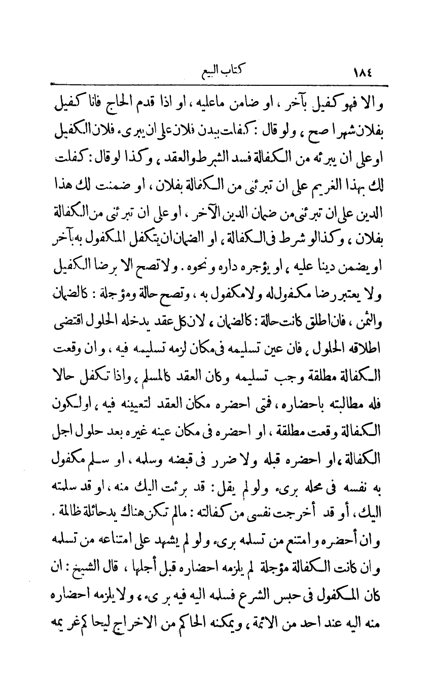 وإلا فهو كفيل آخر أو ضامن ما عليه أو إذا قدم الحاج فانا كفيل بفلان شهرا ضح ولو قال: كفلت ببدن فلان على أن يبرئ فلان الكفيل أو على أن يبرئه من الكفالة فسد الشرط والعقد وكذا لو قال: كفلت لك بهذا الغريم على أن تبرئني من الكفالة بفلان أو ضمنت لك هذا الدين على أن تبرئني من ضمان الدين الآخر أو على أن تبرئني من الكفالة بفلان وكذا لو شرط في الكفالة أو الضمان أن يتكفل المكفول به آخر أو يضمن دينا عليه أو يؤجره داره ونحوه ولا تصح إلا برضا الكفيل ولا يعتبر رضا مكفول له ولا مكفول به وتصح حالة ومؤجلة: كالضمان والثمن فإن أطلق كانت حالة: كالضمان لأن كل عقد يدخله الحلول اقتضى إطلاقه الحلول فإن عين تسليمه في مكان لزمه تسليمه فيه وإن وقعت الكفالة مطلقة وجب تسليمه وكان العقد كالمسلم وإذا تكفل حالا فله مطالبته بإحضاره فمتى احضره مكان العقد لتعيينه فيه أو لكون الكفالة وقعت مطلقة أو أحضره في مكان عينه غيره بعد حلول اجل الكفالة أو أحضره قبله ولا ضرر في قبضه وسلمه أو سلم مكفول به نفسه في محله بريء ولو لم يقل: قد برئت إليك منه أو قد سلمته إليك أو قد أخرجت نفسي من كفالته: ما لم تكن هناك يد حائلة ظالمة وإن أحضره وأمتنع من تسلمه بريء ولو لم يشهد على امتناعه من تسلمه وإن كانت الكفالة مؤجلة لم يلزمه إحضاره قبل أجلها قال الشيخ: إن كان المكفول في حبس الشرع فسلمه إليه فيه بريء ولا يلزمه إحضاره منه إليه عند أحد من الأئمة ويمكنه الحاكم من الإخراج ليحاكم غريمه