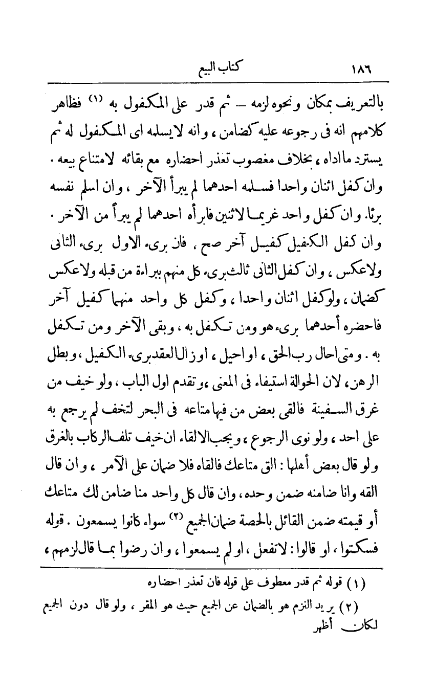 بالتعريف بمكان ونحوه لزمه - ثم قدر على المكفول به1 فظاهر كلامهم أنه في رجوعه عليه كضامن وأنه لا يسلمه أي المكفول له ثم يسترد ما أداه بخلاف مغصوب تعذر إحضاره مع بقائه لامتناع بيعه وإن كفل اثنان واحدا فسلمه أحدهما لم يبرأ الآخر وإن أسلم نفسه برئا وإن كفل واحد غريما لاثنين فأبرأه أحدهما لم يبرأ من الآخر وإن كفل الكفيل كفيل آخر صح فإن بريء الأول بريء الثاني ولا عكس وإن كفل الثاني ثالث بريء كل منهم ببراءة من قبله ولا عكس كضمان ولو كفل اثنان واحدا وكفل كل واحد منهما كفيل آخر فاحضره أحدهما بريء هو ومن تكفل به وبقي الآخر ومن تكفل به ومتى أحال رب الحق أو أحيل أو زال العقد بريء الكفيل وبطل الرهن لأن الحوالة استيفاء في المعنى وتقدم أول الباب ولو خيف من غرق السفينة فألقى بعض من فيها متاعه في البحر لتخف لم يرجع به على أحد ولو نوى الرجوع ويجب الإلقاء إن خيف تلف الركاب بالغرق ولو قال بعض أهلها: الق متاعك فالقاه فلا ضمان على الآمر وإن قال القه وأنا ضامنه ضمن وحده وإن قال كل واحد منا ضامن لك متاعك أو قيمته ضمن القائل الحصة ضمان الجميع سواء كانوا يسمعون قوله فسكتوا أو قالوا: لا تفعل أو لم يسمعوا وإن رضوا بما قال لزمهم،