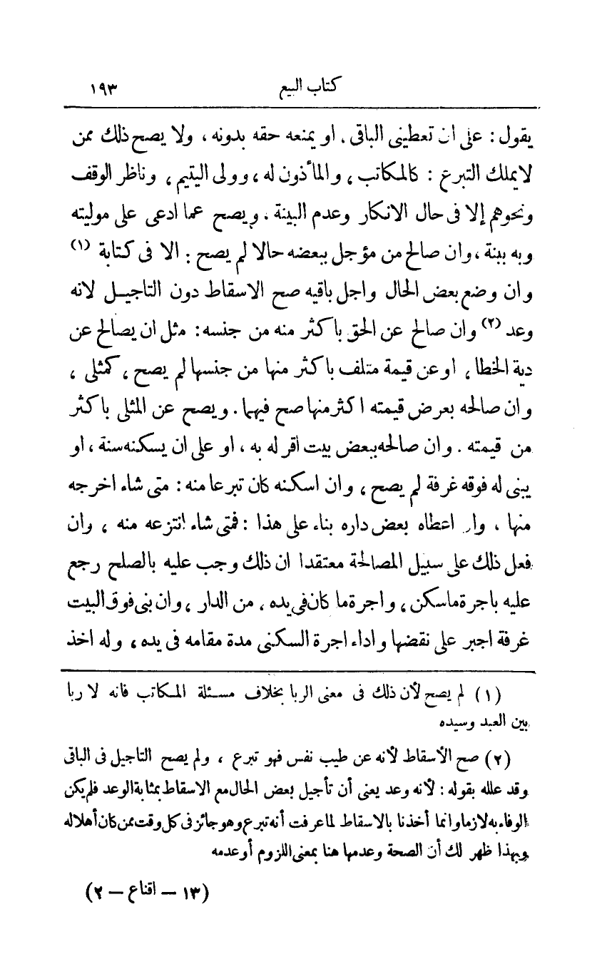 2 صح الأسقاط لأنه عن طيب نفس فهو تبرع، ولم يصح التأجيل في الباقي وقد علله بقوله: لأنه وعد يعنى أن تأجيل بعض الحال مع الأسقاط بمثابة الوعد فلم يكن الفاء به وإنما أخذنا بالأسقاط لما عرفت أنه تبرع وهو جائز في كل وقت ممن كان أهلا له وبهذا ظهر لك أن الصحة وعدمها هنا بمعنى اللزوم أو عدمه.