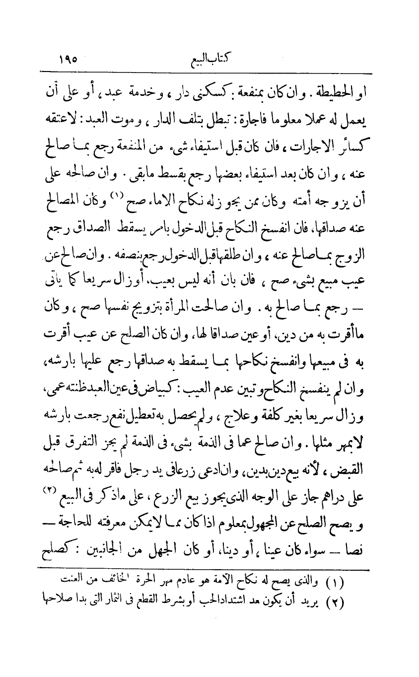 أو الحطيطة وإن كان بمنفعة: كسكنى دار وخدمة عبد أو على أن يعمل له عملا معلوما فإجارة: تبطل بتلف الدار وموت العبد: لا عتقه كسائر الإجازات فإن كان قبل استيفاء شيء من المنفعة رجع بما صالح عنه وإن كان بعد استيفاء بعضها رجع بقسط ما بقي وإن صالحه على أن يزوجه أمته وكان ممن يجوز له نكاح الإماء صح1 وكان المصالح عنه صداقها فإن أنفسخ النكاح قبل الدخول بأمر يسقط الصداق رجع الزوج بما صالح عنه وإن طلقها قبل الدخول رجع بنصفه وإن صالح عن عيب مبيع بشيء صح فإن بان أنه ليس بعيب أو زال سريعا كما يأتي - رجع بما صالح به وإن صالحت المرأة بتزويج نفسها صح وكان ما أقرت به من دين أو عين صداقا لها وإن كان الصلح عن عيب أقرت به في مبيعها وانفسخ نكاحها بما يسقط به صداقها رجع عليها بأرشه وإن لم ينفسخ النكاح وتبين عدم العيب: كبياض في عين العبد ظنته عمى وزال سريعا بغير كلفة وعلاج ولم يحصل به تعطيل نفع رجعت بأرشه لا بمهر مثلها وإن صالح عما في الذمة بشيء في الذمة لم يجز التفرق قبل القبض لأنه بيع دين بدين وإن أدعى زرعا في يد رجل فأقر له به ثم صالحه على دراهم جاز على الوجه الذي يجوز بيع الزرع على ما ذكر في البيع2 ويصح الصلح عن المجهول بمعلوم إذا كان مما لا يمكن معرفته للحاجة - نصا - سواء كان عينا أو دينا أو كان الجهل من الجانبين: كصلح