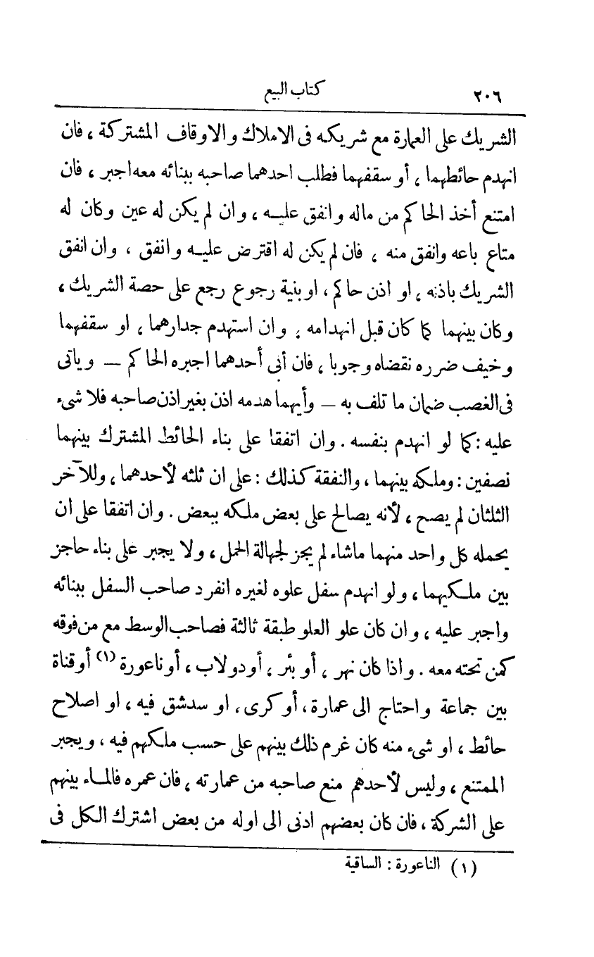 الشريك على العمارة مع شريكه في الأملاك والأوقاف المشتركة فإن انهدم حائطها أو سقفهما فطلب أحدهما صاحبه ببنائه معه أجبر فإن امتنع أخذ الحاكم من ماله وانفق عليه وإن لم يكن له عين وكان له متاع باعه وانفق منه فإن لم يكن له اقترض عليه وانفق وإن انفق الشريك بإذنه أو أذن حاكم أو بنية رجوع رجع على حصة الشريك وكان بينهما كما كان قبل انهدامه وإن استهدم جدارهما أو سقفهما وخيف ضرره نقضاه وجوبا فإن أبى أحدهما أجبره الحاكم - ويأتي في الغصب ضمان ما تلف به - وأيهما هدمه أذن بغير أذن صاحبه فلا شيء عليه: كما لو أنهدم بنفسه وإن اتفقا على بناء الحائط المشترك بينهما نصفين: وملكه بينهما النفقة كذلك: على أن ثلثه لأحدهما وللآخر الثلثان لم يصح لأنه يصالح على بعض ملكه ببعض وإن اتفقا على أن يحمله كل واحد منهما ما شاء لم يجز لجهالة الحمل ولا يجبر على بناء حاجز بين ملكيهما ولو انهدم سفل علوه لغيره انفرد صاحب السفل ببنائه واجبر عليه وإن كان علو العلو طبقة ثالثة فصاحب الوسط مع من فوقه كمن تحته معه وإذا كان نهر أو بئر أو دولاب أو ناعورة1 أو قناة بين جماعة واحتاج إلى عمارة أو كرى أو سدشق فيه أو إصلاح حائط أو شيء منه كان غرم ذلك بينهم على حسب ملكهم فيه ويجبر الممنتع وليس لأحدهم منع صاحبه من عمارته فإن عمره فالماء بينهم على الشركة فإن كان بعضهم أدنى إلى أوله من بعض اشترك الكل في