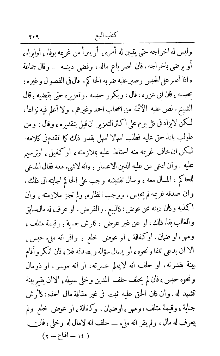 وليس له إخراجه حتى يتبين له أمره أو يبرأ من غريمه بوفاء أو إبراء أو يرضى بإخراجه فإن أصر باع ماله وقضى دينه - وقال جماعة إذا أصر على الحبس وصبر عليه ضربه الحاكم قال في الفصول وغيره: يحبسه فإن أبى عزره قال: ويكرر حبسه وتعزيره حتى يقبضه قال الشيخ: نص عليه الأئمة من أصحاب أحمد وغيرهم ولا أعلم فيه نزاعا لكن لا يزاد في كل يوم على أكثر التعزير إن قبل بتقديره وقال: ومن طولب بأداء حق فطلب إمهالا أمهل بقدر ذلك كما تقدم في كلامه لكن أن خاف غريمه منه احتاط عليه بملازمته أو كفيل أو ترسيم عليه وإن ادعى من عليه الدين الإعسار وأنه لا شيء معه فقال المدعي للحاكم: المال معه وسال تفتيشه وجب على الحاكم إجابته إلى ذلك وإن صدقه غريمه لم يحبس ووجب إنظاره ولم تجز ملازمته وإن أكذبه وكان دينه عن عوض: كالبيع والقرض أو عرف له مال سابق والغالب بقاء ذلك أو عن غير عوض: كأرش جناية وقيمة متلف ومهر أو ضمان أو كفالة أو عوض خلع وأقر أنه ملئ حبس إلا أن يدعى تلفا ونحوه أو يسال سؤاله ويصدقه فلا فإن أنكر وأقام بينة بقدرته أو حلف أنه لا يعلم عسرته أو أنه موسر أو ذو مال ونحوه حبس فإن لم يحلف حلف المدين وخلى سبيله إلا أن يقيم بينة تشهد له وإن كان الحق عليه ثبت في غير مقابلة مال أخذه: كأرش جناية وقيمة متلف ومهر أو ضمان وكفالة أو عوض خلع ولم يعرف له مال ولم يقر أنه ملئ - حلف أنه لا مال له وخلى فإن