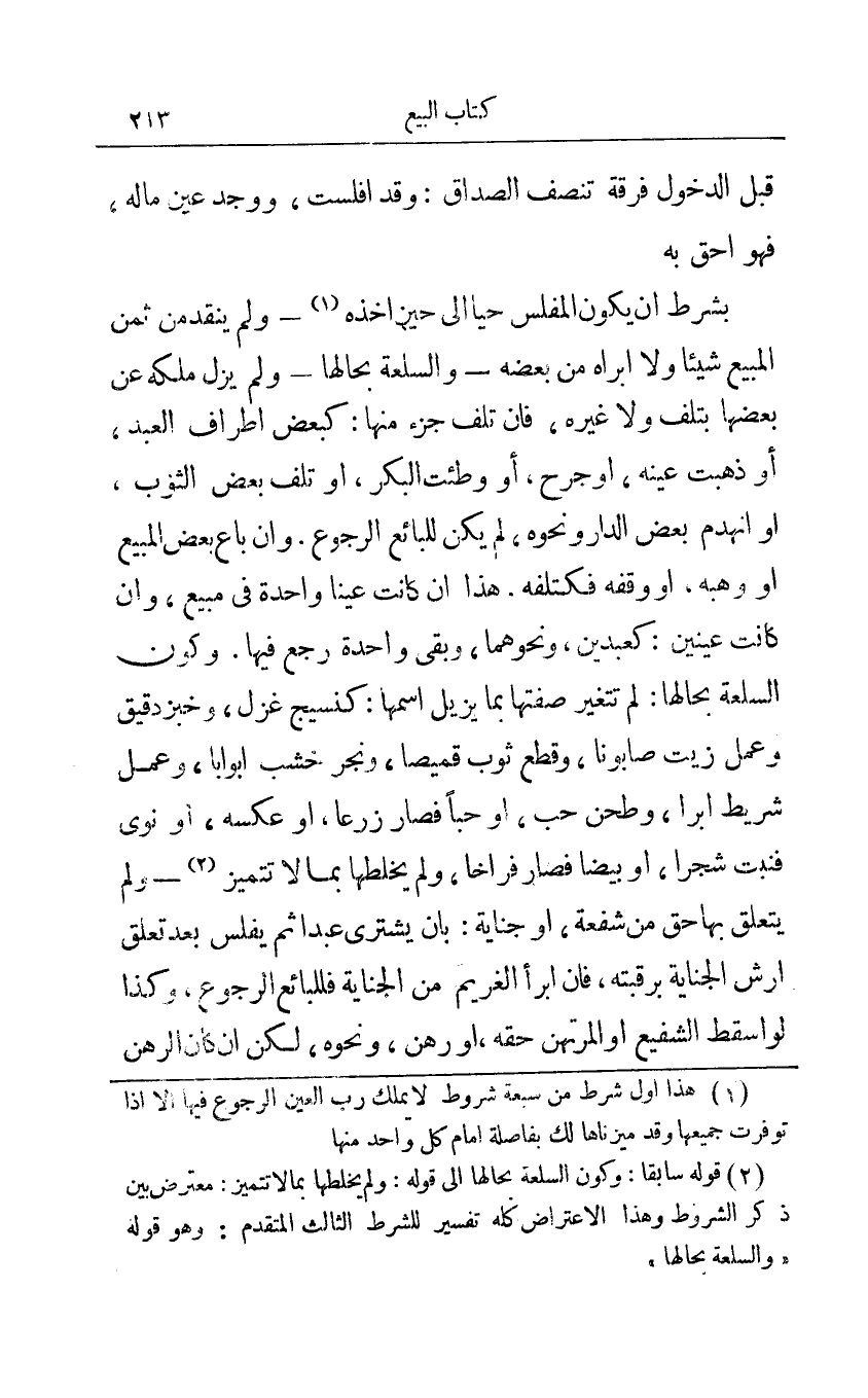 بشرط أن يكون المفلس حيا إلى حين أخذه1 - ولم ينقد من ثمن المبيع شيئا ولا أبراه من بعضه - والسلعة بحالها - ولم يزل ملكه عن بعضها بتلف ولا غيره فإن تلف جزء منها: كبعض أطراف العبد أو ذهبت عينه أو جرح أو وطئت البكر أو تلف بعض الثوب أو انهدم بعض الدار ونحوه لم يكن للبائع الرجوع وإن باع بعض المبيع أو وهبه أو وقفه فكتلفه هذا إن كانت عينا واحدة في مبيع وإن كانت عينين: كعبدين ونحوهما وبقي واحدة رجع فيها: وكون السلعة بحالها: لم تتغير صفتها بما يزيل أسمها: كنسيج غزل وخبز دقيق وعمل زيت صابونا وقطع قميصا ونجر خشب أبوابا وعمل شريط ابرا وطحن حب أو حبا فصار زرعا أو عكسه أو نوى فنبت شجرا أو بيضا فصار فراخا ولم يخلطها بما لا تتميز2 - ولم يتعلق بها حق من شفعة أو جناية: بان يشتري عبدا ثم يفلس بعد تعلق أرش الجناية برقبته فإن ابرأ الغريم من الجناية فللبائع الرجوع وكذا لو اسقط الشفيع أو المرتهن حقه أو رهن ونحوه لكن إن كان الرهن