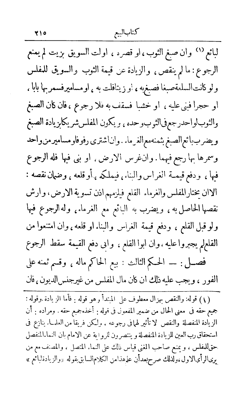 لبائع1 وإن صبغ الثوب أو قصره أولت السويق بزيت لم يمنع الرجوع: ما لم ينقص والزيادة عن قيمة الثوب والسويق للمفلس ولو كانت السلعة صبغا فصبغ به أو زيتا فلت به أو مسامير فسمر بها بابا أو حجرا فبنى عليه أو خشبا فسقف به فلا رجوع فإن كن الصبغ والثوب لواحد رجع في الثوب وحده ويكون المفلس شريكا بزيادة الصبغ ويضرب بائع الصبغ بثمنه مع الغرماء وإن اشترى رفوفا ومسامير من واحد وسمرها بها رجع فيهما وإن غرس الأرض أو بنى فيها فله الرجوع فيها ودفع قيمة الغراس والبناء فيملكه أو قلعه وضمان نقصه: إلا أن يختار المفلس والغرماء القلع فيلزمهم إذن تسوية الأرض وأرش نقصها الحاصل به ويضرب به البائع مع الغرماء وله الرجوع فيها ولو قبل القلع ودفع قيمة الغراس والبناء أو قلعة وإن امتنعوا من القلع لم يجبروا عليه وإن أبوا القلع وأبى دفع القيمة سقط الرجوع.