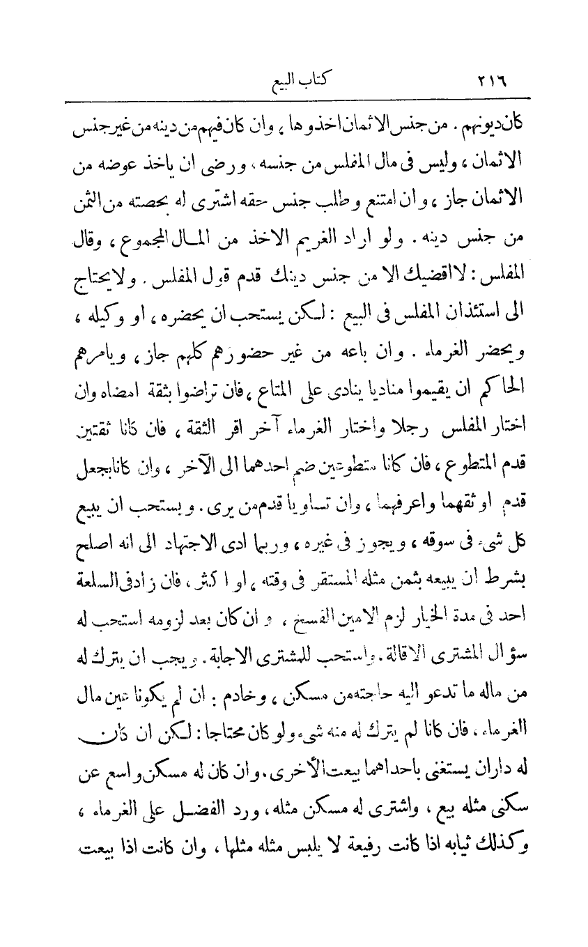 ويجب عليه ذلك إن كان مال المفلس من غير جنس الديون فإن كان ديونهم من جنس الأثمان أخذوها وإن كان فيهم من دينه من غير جنس الأثمان وليس في مال المفلس من جنسه ورضي أن يأخذ عوضه من الأثمان جاز وإن امتنع وطلب جنس حقه اشترى له بحصته من الثمن من جنس دينه ولو أراد الغريم الأخذ من المال المجموع وقال المفلس: لا أقضيك إلا من جنس دينك قدم قول المفلس ولا يحتاج إلى استئذان المفلس في البيع: لكن يستحب أن يحضره أو وكيله ويحضر الغرماء وإن باعه من غير حضورهم كلهم جاز ويأمرهم الحاكم أن يقيموا مناديا ينادي على المتاع فإن تراضوا بثقة إمضاء وإن اختار المفلس رجلا واختار الغرماء آخر أقر الثقة فإن كانا ثقتين قدم المتطوع فإن كانا متطوعين ضم أحدهما إلى الآخر وإن كانا بجعل قدم أوثقهما وأعرفهما وإن تساويا قدم من يرى ويستحب أن يبيع كل شيء في سوقه ويجوز في غيره وربما أدى الاجتهاد إلى أنه أصلح بشرط أن يبيعه بثمن مثله المستقر في وقته أو أكثر فإن زاد في السلعة أحد في مدة الخيار لزم الأمين الفسخ وإن كان بعد لزومه استحب له سؤال المشتري الإقالة واستحب للمشتري الإجابة ويجب أن يترك له من ماله ما تدعو إليه حاجته من مسكن وخادم: إن لم يكونا عين مال الغرماء فإن كانا لم يترك له منه شيء ولو كان محتاجا: لكن إن كان له داران يستغني بإحداهما بيعت الأخرى وإن كان له مسكن واسع عن سكنى مثله بيع واشترى له مسكن مثله ورد الفضل على الغرماء وكذلك ثيابه إذا كانت رفيعة لا يلبس مثله مثلها وإن كانت إذا بيعت