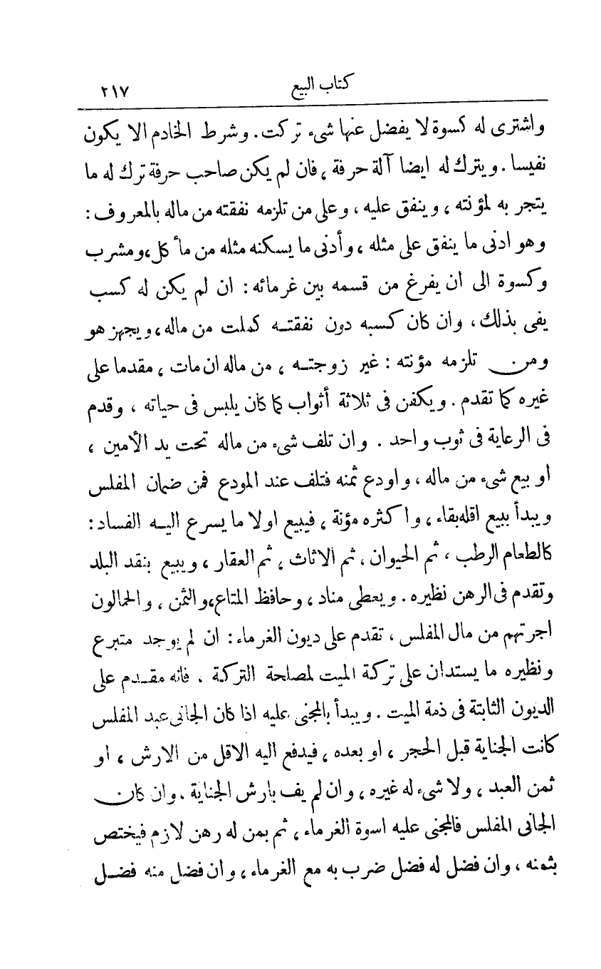 واشترى له كسوة لا يفضل عنها شيء تركت وشرط الخادم إلا يكون نفيسا ويترك له أيضا آلة حرفة فإن لم يكن صاحب حرفة ترك له ما يتجر به لمؤنته وينفق عليه وعلى من تلزمه نفقته من ماله بالمعروف: وهو أدنى ما ينفق على مثله وأدنى ما يسكنه مثله من مأكل ومشرب وكسوة إلى أن يفرغ من قسمه بين غرمائه: إن لم يكن له كسب يفي بذلك وإن كان كسبه دون نفقته كملت من ماله ويجهز هو ومن تلزمه مؤنته: غير زوجته ماله أن مات مقدما على غيره كما تقدم ويكفن في أثواب كما كان يلبس في حياته وقدم في الرعاية في ثوب واحد وإن تلف شيء من ماله تحب يد الأمين أو بيع شيء من ماله وأودع ثمنه فتلف عند المودع فمن ضمان المفلس ويبدأ بيع أقله بقاء وأكثره مؤنة فيبيع أولا ما يسرع إليه الفساد: كالطعام الرطب ثم الحيوان ثم الأثاث ثم العقار وبيع بنقد البلد وتقدم في الرهن نظيره ويعطى مناد وحافظ المتاع والثمن والحمالون أجرتهم من مال المفلس تقدم على ديون الغرماء: إن لم يوجد متبرع ونظيره ما يستدان على تركه الميت لمصلحة التركة فإنه مقدم على الديون الثابتة في ذمة الميت ويبدأ بالمجني عليه إذا كان الجاني عبد المفلس كانت الجناية قبل الحجر أو بعده فيدفع إليه الأقل من الأرش أو ثمن العبد ولا شيء له غيره وإن لم يف بأرش الجناية وإن كان الجاني المفلس فالمجني عليه أسوة الغرماء ثم بمن له رهن لازم فيختص بثمنه وإن فضل له فضل ضرب به مع الغرماء وإن فضل منه فضل