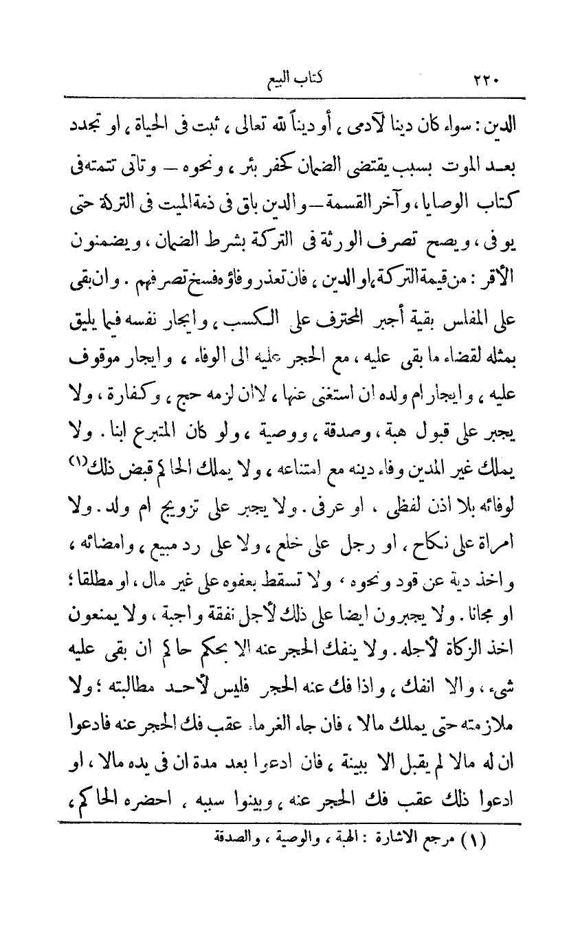 الدين: سواء كان دينا لآدمي أو دينا لله تعالى: ثبت في الحياة أو تجدد بعد الموت بسبب يقتضي الضمان كحفر بئر ونحوه - وتأتي تتمته في كتاب الوصايا وآخر القسمة - والدين باق في ذمة الميت في التركة حتى يوفي ويصح تصرف الورثة في التركة بشرط الضمان ويضمنون الأقر: من قيمة التركة أو الدين فإن تعذر وفاؤه فسخ تصرفهم وإن بقي على المفلس بقية أجبر المحترف على الكسب وإيجار نفسه فيما يليق بمثله لقضاء ما بقي عليه مع الحجر عليه إلى الوفاء وإيجار موقوف عليه وإيجار أم ولده إن استغنى عنها لا إن لزمه حج وكفارة ولا يجبر على قبول هبة وصدقة ووصية ولو كان المتبرع ابنا ولا يملك غير المدين وفاء دينه مع امتناعه ولا يملك الحاكم قبض ذلك1 لوفائه بلا أذن لفظي أو عرفي ولا يجبر على تزويج أم ولد ولا امرأة على نكاح أو رجل على خلع ولا على رد مبيع وإمضائه وأخذ دية عن قود ونحوه ولا تسقط بعفوه على غير مال أو مطلقا أو مجانا ولا يجبرون أيضا على ذلك لأجل نفقة واجبة ولا يمنعون أخذ الزكاة لأجله ولا ينفك الحجر عنه إلا بحكم حاكم إن بقي عليه شيء وإلا انفك وإذا فك عنه الحجر فليس لأحد مطالبته ولا ملازمته حتى يملك مالا فإن جاء الغرماء عقب فك الحجر عنه فادعوا أن له مالا لم يقبل إلا ببينة فإن ادعوا بعد مدة أن في يده مالا أو ادعوا ذلك عقب فك الحجر عنه وبينوا سببه أحضره الحاكم،