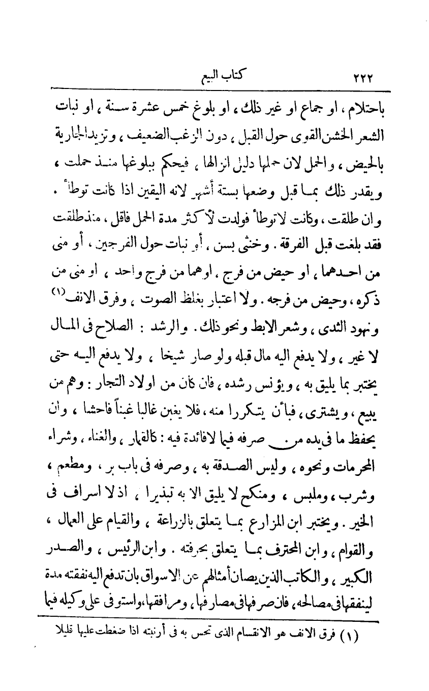 باحتلام أو جماع أو غير ذلك أو بلوغ خمس عشرة سنة أو نبات الشعر الخشن القوي حول القبل دون الزغب الضعيف وتزيد الجارية بالحيض والحمل لأن حملها دليل إنزالها فيحكم ببلوغها منذ حملت ويقدر ذلك بما قبل وضعها بستة أشهر لأنه اليقين إذا كانت توطأ وإن طلقت وكانت لا توطأ فولدت لأكثر مدة الحمل فاقل منذ طلقت فقد بلغت قبل الفرقة وخنثى بسن أو نبات حول الفرجين أو مني من أحدهما أو حيض من فرج أو هما من فرج واحد أو مني من ذكره وحيض من فرجه ولا اعتبار بغلظ الصوت وفرق الأنف1 ونهود الثدي وشعر الإبط ونحو ذلك والرشد: الصلاح في المال لا غير ولا يدفع إليه مال قبله ولو صار شيخا ولا يدفع إليه حتى يختبر بما يليق به ويؤنس رشده فإن كان من أولاد التجار: وهو من يبيع ويشتري فبان بتكررا منه فلا يغبن غالبا غبنا فاحشا وإن يحفظ ما في يده من صرفه فيما لا فائدة فيه: كالقمار والغناء وشراء المحرمات ونحوه وليس الصدقة به وصرفه في باب بر ومطعم وشرب وملبس ومنكح لا يليق إلا به تبذيرا إذ لا إسراف في الخير ويختبر ابن المزارع بما يتعلق بالزراعة والقيام على العمال والقوام وابن المحترف بما يتعلق بحرفته وابن الرئيس والصدر الكبير والكاتب الذين يصان أمثالهم عن الأسواق بأن تدفع إليه نفقته مدة لينفقها في مصالحه فإن صرفها في مصارفها ومرافقها واستوفى على وكيله فيما