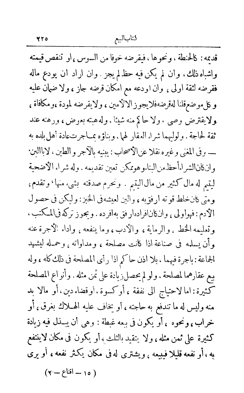 قديمه: كالحنطة ونحوهما فيقرضه خوفا من السوس أو تنقص قيمته وأشباه ذلك وإن لم يكن فيه حظ لم يجز وإن أراد أن يودع ماله وكل موضع قلنا له قرضه فلا يجوز إلا لأمين ولا يقرضه لمودة ومكافأة ولا يقترض وصي ولا حاكم منه شيئا وله هبته بعرض ورهنه عند ثقة لحاجة ولوليهما شراء العقار لهما وبناؤه بما جرت عادة أهل بلد به - وفي المغني وغيره نقلا عن الأصحاب: يبنيه بالآجر والطين لا باللبن وإن كان الشراء أحط من البناء وهو ممكن تعين تقديمه وله شراء الأضحية ليتيم له مال كثير من ل اليتيم وتحرم صدقته بشيء منها وتقدم ومتى كان خلط قوته أرفق به والين لعيشه في الخبز: وليكن في حصول الأدم: فهو أولى وإن كان إفراده أرفق به أفرده ويجوز تركه في المكتب وتعليمه الخط والرماية والأدب وما ينفعه وأداء الأجرة عنه وإن يسلمه في صناعة إذا كانت مصلحة ومداواته وحمله ليشهد الجماعة: باجرة فيهما لا أذن حاكم إذا رأى المصلحة في ذلك كله وله بيع عقارهما لمصلحة ولو لم يحصل زيادة على ثمن مثله وأنواع المصلحة كثيرة: إما لاحتياج إلى نفقة أو كسوة أو قضاء دين أو ما لابد منه وليس له ما تندفع به حاجته أو يخاف عليه الهلاك بغرق أو خراب ونحوه أو يكون في بيعه غبطة: وهي أن يبذل فيه زيادة كثيرة على ثمن مثله ولا يتقيد بالثلث أو يكون في مكان لا ينتفع به أو نفعه قليلا فيبيعه ويشتري له في مكان يكثر نفعه أو يرى