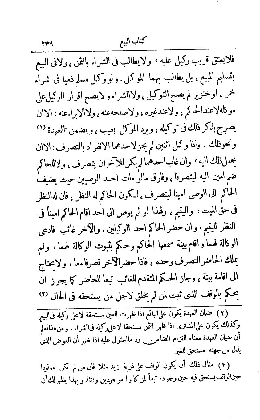 فلا يعتق قريب وكيل عليه ولا يطالب في الشراء بالثمن ولا في البيع بتسليم المبيع بل يطالب بهما الموكل ولو وكل مسلم ذميا في شراء خمر أو خنزير لم يصح التوكيل ولا الشراء ولا يصح إقرار الوكيل على موكله لا عند الحاكم ولا عند غيره ولا صلحه عنه ولا الإبراء عنه: إلا أن يصرح بذكر ذلك في توكيله ويرد الموكل بعيب ويضمن العهدة1 ونحو ذلك وإذا وكل اثنين لم يجز لأحدهما الانفراد بالتصرف: إلا أن يجعل ذلك إليه وإن غاب أحدهما لم يكن للآخر أن يتصرف ولا للحاكم ضم أمين إليه ليتصرفا وفارق ما لو مات أحد الوصيين حيث يضيف الحاكم إلى الوصي أمينا ليتصرف لكون الحاكم له النظر فإن له النظر في حق الميت واليتيم ولهذا لو لم يوص إلى أحد أقام الحاكم أمينا في النظر لليتيم وإن حضر الحاكم أحد الوكيلين والآخر غائب فادعى الوكالة لهما وأقام بينة سمعها الحاكم وحكم بثبوت الوكالة لهما ولم يملك الحاضر التصرف وحده فإذا حضر الآخر تصرفا معا ولا يحتاج إلى إقامة بينة وجاز الحكم المتقدم للغائب تبعا للحاضر كما يجوز أن يحكم بالوقف الذي ثبت لمن لم يخلق لأجل من يستحقه في الحال2