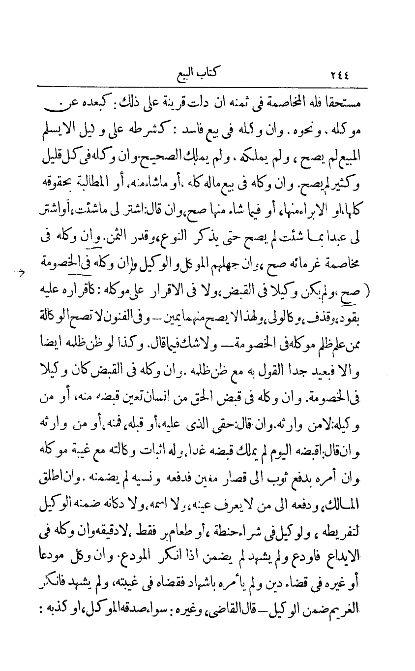 مستحقا فله المخاصمة في ثمنه إن دلت قرينة على ذلك: كبعده عن موكله ونحوه وإن وكله في بيع فاسد: كشرطه على وكيل إلا يسلم المبيع لم يصح ولم يملكه ولم يملك الصحيح وإن وكله في كل قليل وكثير لم يصح وإن وكله في بيع ماله كله أو ما شاء منه أو المطالبة بحقوقه كلها أو الإبراء منها أو فيما شاء منها صح وإن قال: أشتر لي ما شئت أو اشتر لي عبدا بما شئت لم يصح حتى يذكر النوع وقدر الثمن وإن وكله في مخاصمة غرمائه صح وإن جهلهم الموكل والوكيل وإن وكله في الخصومة صح ولم يكن وكيلا في القبض ولا في الإقرار على موكله: كإقراره عليه بقود وقذف وكالولي ولهذا لا يصح منهما يمين - وفي الفنون لا تصح الوكالة ممن علم ظلم موكله في الخصومة - ولا شك فيما قال وكذا ظن ظلمه أيضا وإلا فبعيد جدا القول به مع ظن ظلمه وإن وكله في القبض كان وكيلا في الخصومة وإن وكله في قبض الحق من إنسان تعين قبضه منه أو من وكيله: لا من وارثه وإن قال: حقي الذي عليه أو قبله فمنه أو من وارثه وإن قال: أقبضه اليوم لم يملك قبضه غدا وله إثبات وكالته مع غيبة موكله وإن أمره بدفع ثوب إلى قصار معين فدفعه ونسيه لم يضمنه وإن أطلق المالك ودفعه إلى من لا يعرف عينه ولا اسمه ولا دكانه ضمنه الوكيل لتفريطه ولوكيل في شراء حنطة أو طعام بر فقط لا دقيقة وإن وكله في الإيداع فأودع ولم يشهد لم يضمن إذا أنكر المودع وإن وكل مودعا أو غيره في قضاء دين ولم يأمره بإشهاد فقضاء في غيبته ولم يشهد فأنكر الغريم ضمن الوكيل - قال القاضي وغيره سواء صدقه الموكل أو كذبه:
