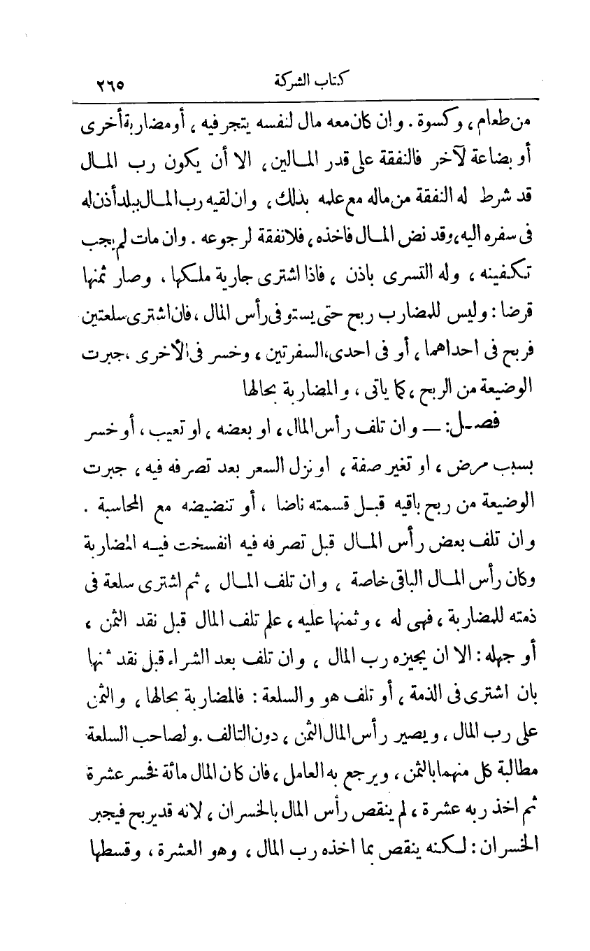 أو بعضه أو تعيب أو خسر بسبب مرض أو تغير صفة أو نزل السعر بعد تصرفه فيه جبرت الوضيعة من ربح باقيه قبل قسمته ناضا أو تنضيضه مع المحاسبة وإن تلف بعض رأس المال قبل تصرفه فيه انفسخت فيه المضاربة وكان رأس المال الباقي خاصة وإن تلف المال ثم اشترى سلعة في ذمته للمضاربة فهي له وثمنها عليه علم تلف المال قبل نقد الثمن أو جهله: إلا أن يجيزه رب المال وإن تلف بعد الشراء قبل نقد ثمنها بان اشترى في الذمة أو تلف هو والسلعة: فالمضاربة بحالها والثمن على رب المال ويصير رأس المال الثمن دون التالف ولصاحب السلعة مطالبة كل منها بالثمن ويرجع به العامل فإن كان المال مائة فخسر عشرة ثم أخذ ربه عشرة لم ينقص رأس المال بالخسران لأنه قد يربح فيجبر الخسران: لكنه ينقص بما أخذه رب المال وهو العشرة وقسطها