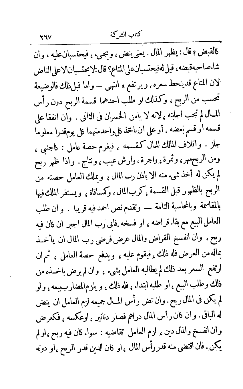كالقبض؟ قال: يظهر المال يعني ينض ويجيء فيحتسبان عليه وإن شاء صاحبه قبضه قيل له فيحتسبان على المتاع؟ قال: لا يحتسبان إلا على الناض لأن المتاع قد ينحط سعره ويرتفع انتهى - وأما قبل ذلك فالوضيعة تحسب من الربح وكذلك لو طلب أحدهما قسمة الربح دون رأس المال لم تجب أجابته لأنه لا يأمن الخسران في الثاني وإن اتفقا على قسمه أو قسم بعضه أو على أن يأخذ كل واحد منهما كل يوم قدرا معلوما جاز وإتلاف المالك للمال كقسمه فيغرم حصة عامل: كأجنبي ومن الربح مهر وثمرة وأجرة وأرش عيب ونتاج وإذا ظهر ربح لم يكن له أخذ شيء منه إلا بأذن رب المال ويملك العامل حصته من الربح بالظهور قبل القسمة كرب المال وكمساقاة ويستقر الملك فيها بالمقاسمة وبالمحاسبة التامة - وتقدم نص أحمد فيه تقريبا وإن طلب العامل البيع مع بقاء قراضه أو فسخه فأبى رب المال أجبر إن كان فيه ربح وإن انفسخ القراض والمال عرض فرضي رب المال أن يأخذ بماله من العرض فله ذلك فيقوم عليه ويدفع حصة العامل ثم إن ارتفع السعر بعد ذلك لم يطالبه العامل بشيء وإن لم يرض بأخذه من ذلك وطلب البيع أو طلبه ابتداء فله ذلك ويلزم المضارب بيعه ولو لم يكن في المال ربح وإن نض رأس المال جميعه لزم العامل أن ينض له الباقي وإن كان رأس المال دراهم فصار دنانير أو عكسه فكعرض وإن انفسخ والمال دين لزم العامل تقاضيه: سواء كان فيه ربح أو لم يكن فإن اقتضى منه قدر رأس المال أو كان الدين قدر الربح أو دونه