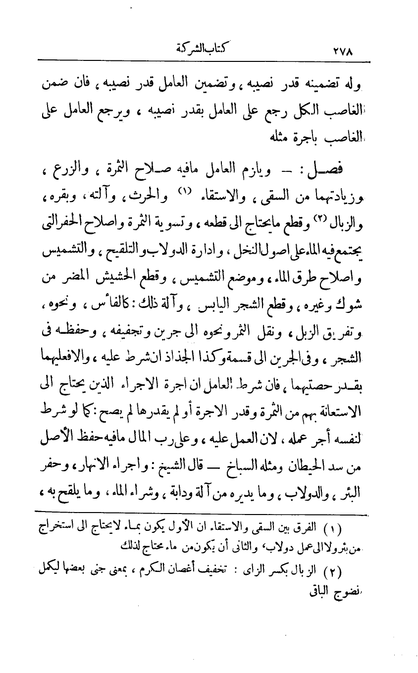 والزرع وزيادتهما من السقي والاستقاء1 والحرث وآلته وبقره والزبال2 وقطع ما يحتاج إلى قطعه وتسوية الثمرة وإصلاح الحفر التي يجتمع فيه المال على أصول النخل وإدارة الدولاب والتلقيح والتشميس وإصلاح طرق الماء وموضع التشميس وقطع الحشيش المضر من شوك وغيره وقطع الشجر اليابس وآلة ذلك: كالفأس ونحوه وتفريق الزبل ونقل الثمر ونحوه إلى جرين وتجفيفه وحفظه في الشجر وفي الجرين إلى قسمة وكذا الجذاذ إن شرط عليه وإلا فعليهما بقدر حصتيها فإن شرط العامل أن أجرة الأجراء الذين يحتاج إلى الاستعانة بهم من الثمرة وقدر الأجرة أو لم يقدرها لم يصح: كما لو شرط لنفسه أجر عمله لأن العمل عليه وعلى رب المال ما فيه حفظ الأصل من سد الحيطان ومثله السباخ - قال الشيخ: وإجراء الأنهار وحفر البئر والدولاب وما يديره من آلة ودابة وشراء المال وما يلقح به،