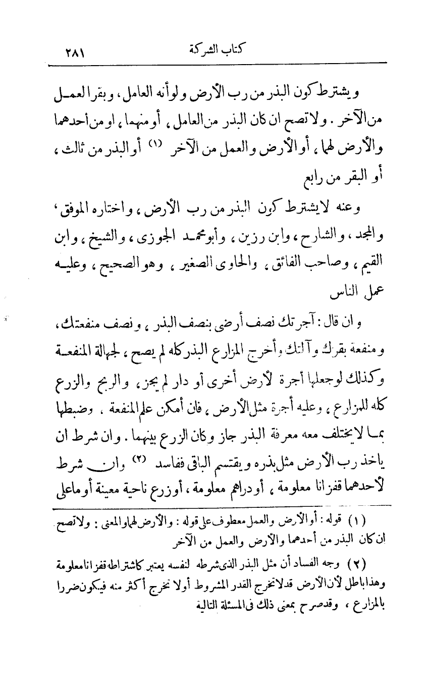 ويشترط كون البذر من رب الأرض ولو أنه العامل وبقر العمل من الآخر ولا تصح إن كان البذر من العامل أو منهما أو من أحدهما والأرض لهما أو الأرض والعمل من الآخر1أو البذر من ثالث أو البقر من رابع.