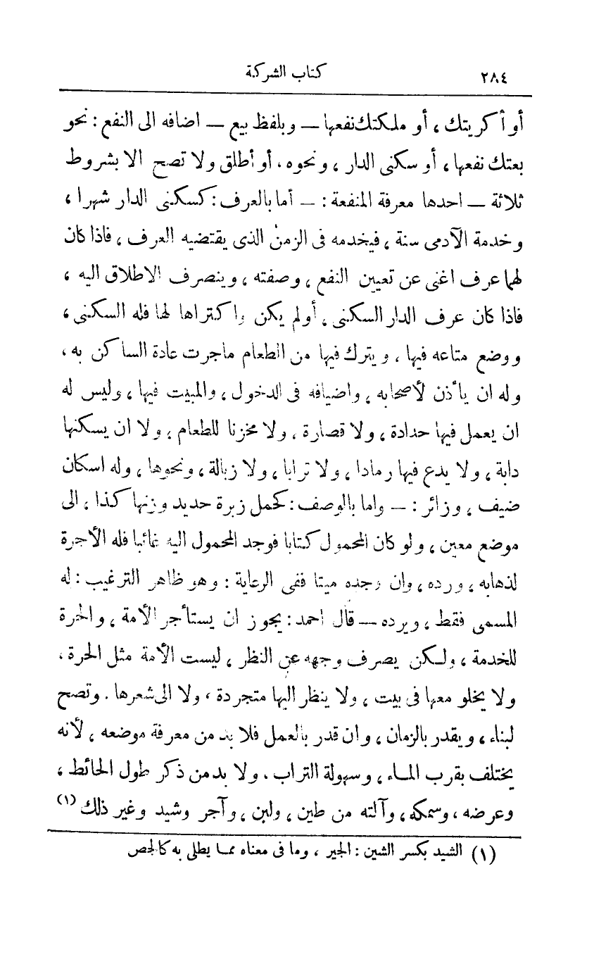 أو أكريتك أو ملكتك نفعها - وبلفظ بيع - إضافة إلى النفع: نحو بعتك نفعها أو سكني الدار ونحوه أو أطلق ولا تصح إلا بشروط ثلاثة - أحدها معرفة المنفعة:- أما بالعرف: كسكنى الدار شهرا وخدمة الآدمي سنة فيخدمه في الزمن الذي يقتضيه العرف فإذا كان لهما عرف أغنى عن تعيين النفع وصفته وينصرف الإطلاق إليه فإذا كان عرف الدار السكني أو لم يكن واكتراها لها فله السكنى ووضع متاعه فيها ويترك فيها من الطعام ما جرت عادة الساكن به وله أن يأذن لأصحابه وأضيافه في الدخول والمبيت فيها وليس له أن يعمل فيها حدادة ولا قصارة ولا مخزنا للطعام ولا أن يسكنها دابة ولا يدع فيها رمادا ولا ترابا ولا زبالة ونحوها وله إسكان ضيف زائر:- وإما بالوصف: كحمل زبرة حديد وزنها كذا إلى موضع معين ولو كان المحمول كتابا فوجد المحمول إليه غائبا فله الأجرة لذهابه ورده وإن وجده ميتا ففي الرعاية: وهو ظاهر الترغيب له المسمى فقط ويرده - قال أحمد: يجوز أن يستأجر الأمة والحرة للخدمة ولكن يصرف وجهه عن النظر ليست الأمة مثل الحرة ولا يخلو معها في بيت ولا ينظر إليها متجردة ولا إلى شعرها وتصح لبناء ويقدر بالزمان وإن قدر بالعمل فلا بد من معرفة موضعه لأنه يختلف بقرب الماء وسهولة التراب ولا بد من ذكر طول الحائط وعرضه سمكه وآلته من طين ولبن وآجر وشيد وغير ذلك1