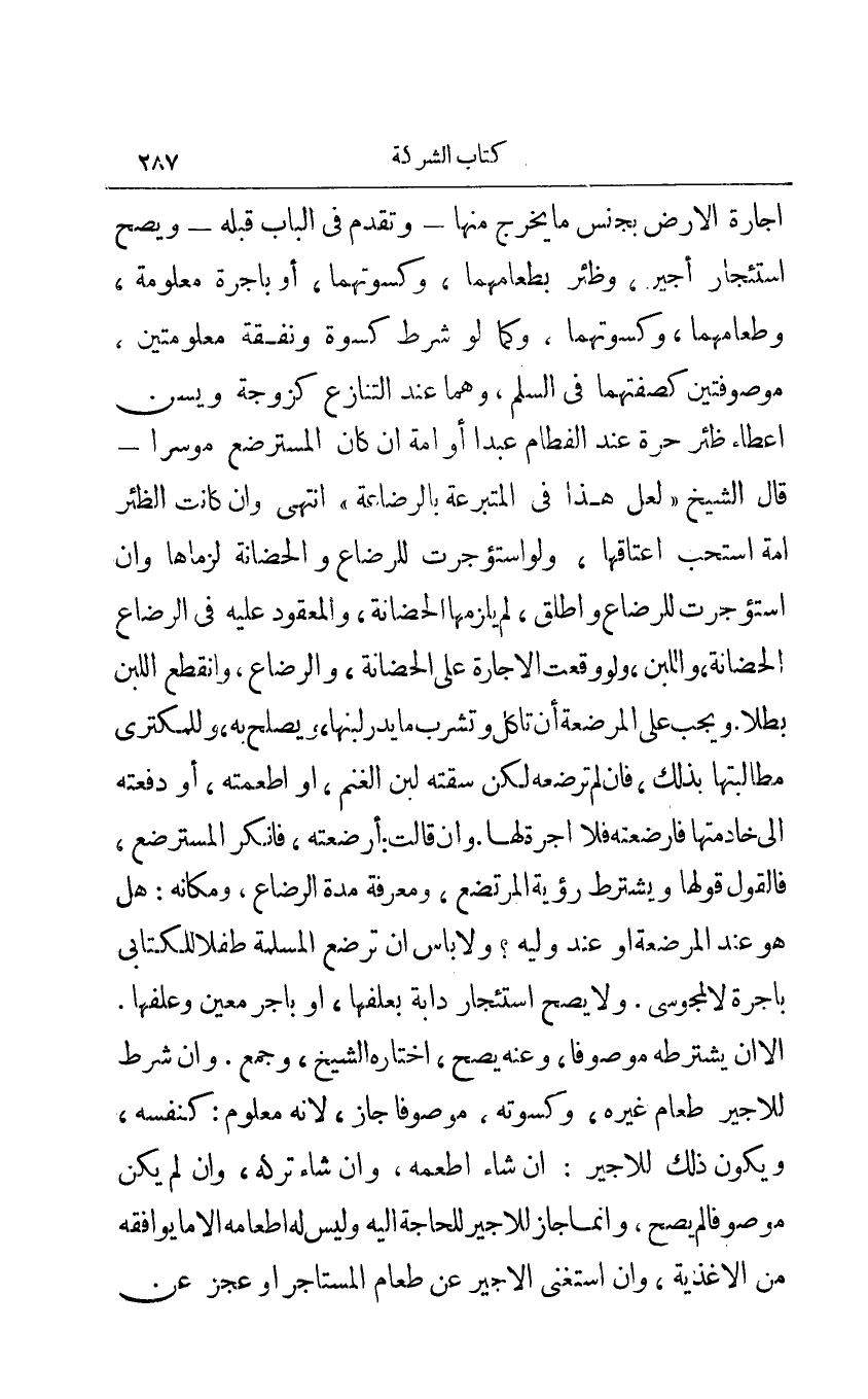 كثمن والمعينة كمبيع ولو جعل الأجرة صبرة دراهم أو غيرها صحت: كبيع ويجوز إجارة الأرض بجنس ما يخرج منها - وتقدم في الباب قبله - ويصح استئجار أجير وظئر بطعامهما وكسوتهما أو بأجرة معلومة وطعامهما وكسوتهما وكما لو شرط كسوة ونفقة معلومتين موصوفتين كصفتهما في السلم وهما عند التنازع كزوجة ويسن إعطاء ظئر حرة عند الفطام عبدا أو أمة إن كان المسترضع موسرا - قال الشيخ: لعل هذا في المتبرعة بالرضاعة انتهى وإن كان الظئر أمة استحب إعتاقها ولو استؤجرت للرضاع والحضانة لزماها وإن استؤجرت للرضاع وأطلق لم يلزمها الحضانة والمعقود عليه في الرضاع الحضانة واللبن ولو وقعت الإجارة على الحضانة والرضاع وانقطع اللبن بطلا ويجب على المرضعة أن تأكل وتشرب ما يدر لبنها ويصلح به وللمكتري مطالبتها بذلك فإن لم ترضعه لكن سقته لبن الغنم أو أطعمته أو دفعته إلى خادمتها فأرضعه فلا أجرة لها وإن قالت: أرضعته فأنكر المسترضع فالقول قولها ويشترط رؤية المرتضع ومعرفة مدة الرضاع ومكانه: هل هو عند المرضعة أو عند وليه؟ ولا بأس أن ترضع المسلمة طفلا للكتابي بأجرة لا لمجوسي ولا يصح استئجار دابة بعلفها أو بأجر معين وعلفها إلا أن يشترطه موصوفا وعنه يصح اختاره الشيخ وجمع أو إن شرط للأجير طعام غيره وكسوته موصوفا جاز لأنه معلوم: كنفسه ويكون ذلك للأجير: إن شاء أطعمه وإن شاء تركه وإن لم يكن موصوفا لم يصح وإنما جاز للأجير للحاجة إليه وليس له أطعامه إلا ما يوفقه من الأغذية وإن استغنى الأجير عن طعام المستأجر أو عجز عن