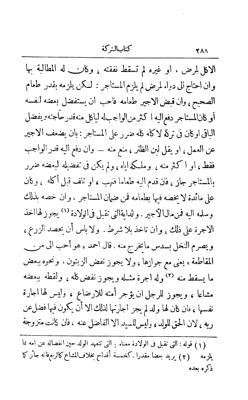 الأكل لمرض أو غيره لم تسقط نفقته وكان له المطالبة بها وإن احتاج إلى دواء لمرض لم يلزم المستأجر: لكن يلزمه بقدر طعام الصحيح وإن قبض الأجير طعامه فأحب أن يستفضل بعضه لنفسه أو كان المستأجر دفع إليه أكثر من الواجب له ليأكل منه قدر حاجته ويفضل الباقي أو كان في تركه لأكله كله ضرر على المستأجر: بأن يضعف الأجير عن العمل أو يقل لبن الظئر منع منه - وإن دفع إليه قدر الواجب فقط أو أكثر منه وملكه إياه ولم يكن في تفضيله لبعضه ضرر بالمستأجر جاز فإن قدم إليه طعاما فنهب أو تلف قبل أكله وكان على مائدة لا يخصه فيها بطعامه فمن ضمان المستأجر وإن خصه بذلك وسلمه إليه فمن مال الأجير والداية التي تقبل في الولادة1 يجوز لها أخذ الأجرة على ذلك وإن تأخذ بلا شرط ولا بأس أن يحصد الزرع ويصوم النخل بسدس ما يخرج منه قال أحمد هو أحب إلي من المقاطعة يعني مع جوازها ولا يجوز نفض الزيتون ونحوه ببعض ما يسقط منه2 ولا أجرة مثله ويجوز نفض كله ولقطه ببعضه مشاعا ويجوز للرجل أن يؤجر أمته للإرضاع وليس لها إجارة نفسها فإن كان لها ولد لم يجز إجارتها لذلك إلا أن يكون فيها فضل عن ربه لأن الحق للولد وليس للسيد إلا الفاضل عنه فإن كانت متزوجة
