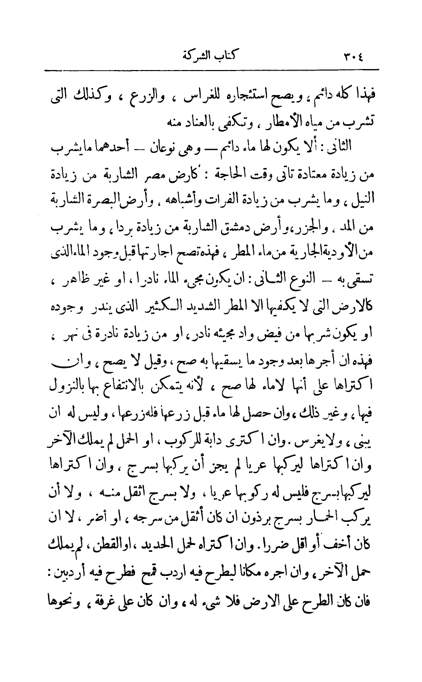 الثاني: ألا يكون لها ماء دائم - وهي نوعان - أحدهما ما يشرب من زيادة معتادة تأتي وقت الحاجة: كأرض مصر الشاربة من زيادة النيل وما يشرب من زيادة الفرات وأشباهه وأرص البصرة الشاربة من المد والجزر وأرض دمشق الشاربة من زيادة بردا وما يشرب من الأودية الجارية من ماء المطر فهذه تصح إجارته قبل وجود الماء الذي تسقى به - النوع الثاني: أن يكون مجيء الماء نادرا أو غير ظاهر كالأرض التي لا يكفيها إلا المطر الشديد الكثير الذي يندر وجوده أو يكون شربها من فيض واد مجيئه نادر أو من زيادة نادرة في نهر فهذه إن أجرها بعد وجود ما يسقيها به صح وقيل لا يصح وإن اكتراها على أنها لا ماء لها صح لأنه يتمكن بالانتفاع بها بالنزول فيها وغير ذلك وإن حصل لها ماء قبل زرعها فله زرعها وليس له أن يبني ولا يغرس وإن اكترى دابة للركوب أو الحمل لم يملك الآخر وإن اكتراها ليركبها عريا لم يجز أن يركبها بسرج وإن اكتراها ليركبها بسرج فليس له ركوبها عريا ولا بسرد أثقل منه ولا أن يركب الحمار بسرد برذون إن كان أثقل من سرجه أو أضر لا إن كان أخف أو أقل ضررا وإن اكتراه لحمل الحديد أو القطن لم يملك حمل الآخر وإن أجره مكانا ليطرح فيه أردب قمح فطرح فيه أردبين: فإن كان الطرح على الأرض فلا شيء له وإن كان على غرفة ونحوها