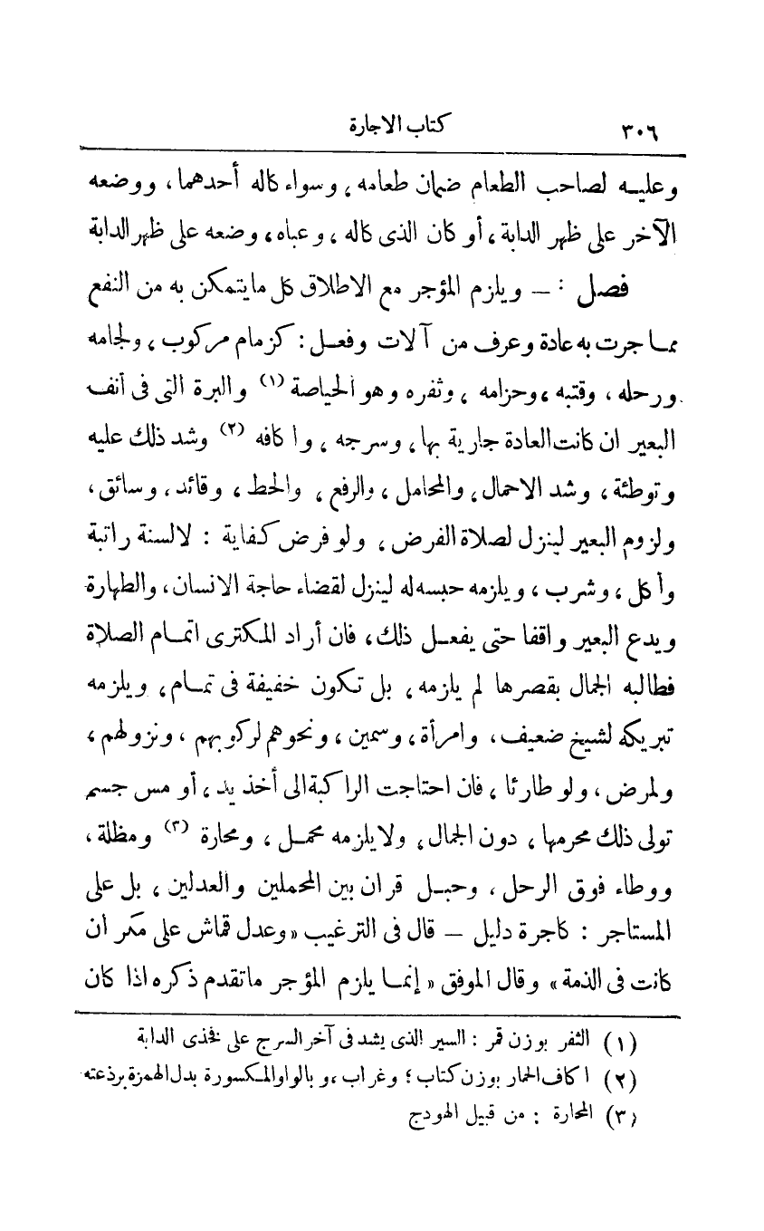 مما جرت به عادة وعرف من آلات وفعل: كزمام مركوب ولجامه وحله وقتبه وحزامه وثفره وهو الحياصة1 والبرة التي في أنف البعير إن كانت العادة جارية بها وسرجه وإكافه2 وشد ذلك عليه وتوطئة وشد الأحمال والمحامل والرفع والحط وقائد وسائق ولزوم البعير لينزل لصلاة الفرض ولو فرض كفاية: لا لسنة راتبة وأكل وشرب ويلزمه حبسه له لينزل لقضاء حاجة الإنسان والطهارة ويدع البعير واقفا حتى يفعل ذلك فإن أراد المكتري إتمام الصلاة فطالبه الجمال بقصرها لم يلزمه بل تكون خفيفة في تمام ويلزمه تبريكه لشيخ ضعيف وامرأة وسمين ونحوهم لركوبهم ونزولهم ولمرض ولو طارئا فإن احتاجت الراكبة إلى أخذ يد أو مس جسم تولى ذلك محرمها دون الجمال ولا يلزمه محمل ومحارة3 ومظلة ووطاء فوق الرحل وحبل قران بين المحملين والعدلين بل على المستأجر: كأجرة دليل - قال في الترغيب وعدل قماش على مكر إن كانت في الذمة وقال الموفق إنما يلزم المؤجر ما تقدم ذكره إذا كان