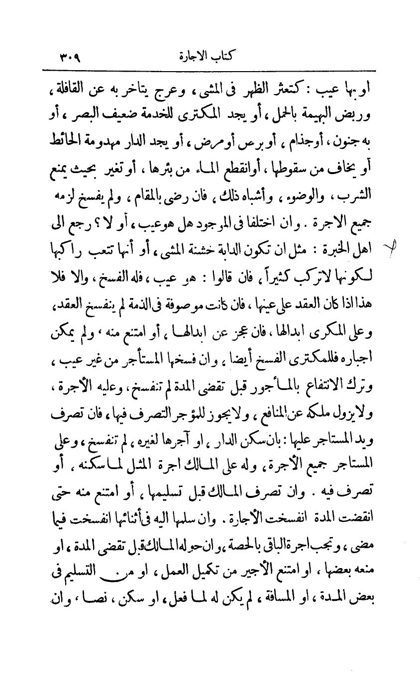أو بها عيب: كتعثر الظهر في المشي وعرج يتأخر به عن القافلة وربض البهيمة بالحمل أو يجد المكتري للخدمة ضعيف البصر أو به جنون أو جذام أو برص أو مرض أو يجد الدار مهدومة الحائط أو يخاف من سقوطها أو انقطع الماء من بئرها أو تغير بحيث يمنع الشرب والوضوء وأشباه ذلك فإن رضي بالمقام ولم يفسخ لزمه جميع الأجر وإن اختلفا في الموجود هل عيب أو لا؟ رجع إلى أهل الخيرة: مثل أن تكون الدابة خشنة المشي أو أنها تتعب راكبها لكونها لا تركب كثيرا فإن قالوا: هو عيب فله الفسخ وإلا فلا هذا إذا كان العقد على عينها فإن كانت موصوفة في الذمة لم يفسخ العقد وعلى المكري إبدالها فإن عجز عن إبدالها أو أمتنع منه ولم يمكن إجباره فللمكتري الفسخ أيضا وإن فسخها المستأجر من غير عيب وترك الانتفاع بالمأجور قبل تقضي المدة لم تنفسخ وعليه الأجرة ولا يزول ملكه عن المنافع ولا يجوز للمؤجر التصرف فيها فإن تصرف ويد المستأجر جميع الأجرة وله على المالك أجرة المثل لما سكنه أو تصرف فيه وإن تصرف المالك قبل تسليمها أو امتنع منه حتى انقضت المدة انفسخت الإجارة وإن سلمها إليه في أثنائها انفسخت فيما مضى وتجب أجرة الباقي بالحصة وإن حوله المالك قبل تقضي المدة أو منعه بعضها أو أمتنع الأجير من تكميل العمل أو من التسليم في بعض المدة أو المسافة لم يكن له لما فعل أو سكن نصا وإن