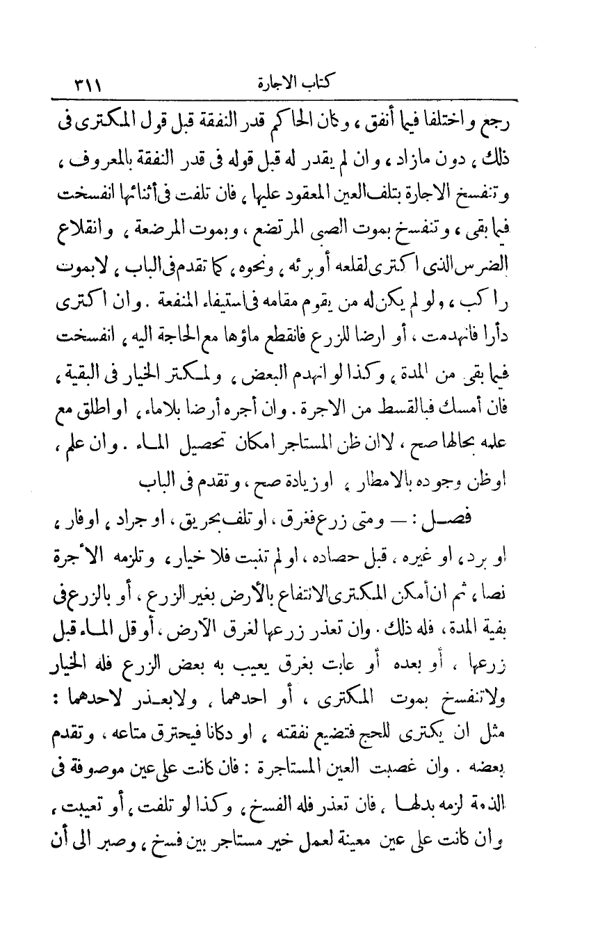 رجع واختلفا فيما أنفق وكان الحاكم قدر النفقة قبل قول المكتري في ذلك دون ما زاد وإن لم يقدر له قبل قوله في قدر النفقة بالمعروف وتنفسخ الإجارة بتلف العين المعقود عليها فإن تلفت في أثنائها انفسخت فيما بقي وتنفسخ بموت الصبي المرتضع وبموت المرضعة وانقلاع الضرس الذي اكترى لقلعه أو برئه ونحوه كما تقدم في الباب لا بموت راكب ولو لم يكن له من يقوم مقامه في استيفاء المنفعة وإن اكترى دارا فانهدمت أو أرضا للزرع فانقطع ماؤها مع الحاجة إليه انفسخت فيم بقي من المدة وكذا لو انهدم البعض ولمكتر الخيار في البقية فإن أمسك فبالقسط من الأجرة وإن أجره أرضا بلا ماء أو أطلق مع علمه بحالها صح لا إن ظن المستأجر مكان تحصيل الماء وإن علم أو ظن وجوده بالأمطار أو زيادة صح وتقدم في الباب.