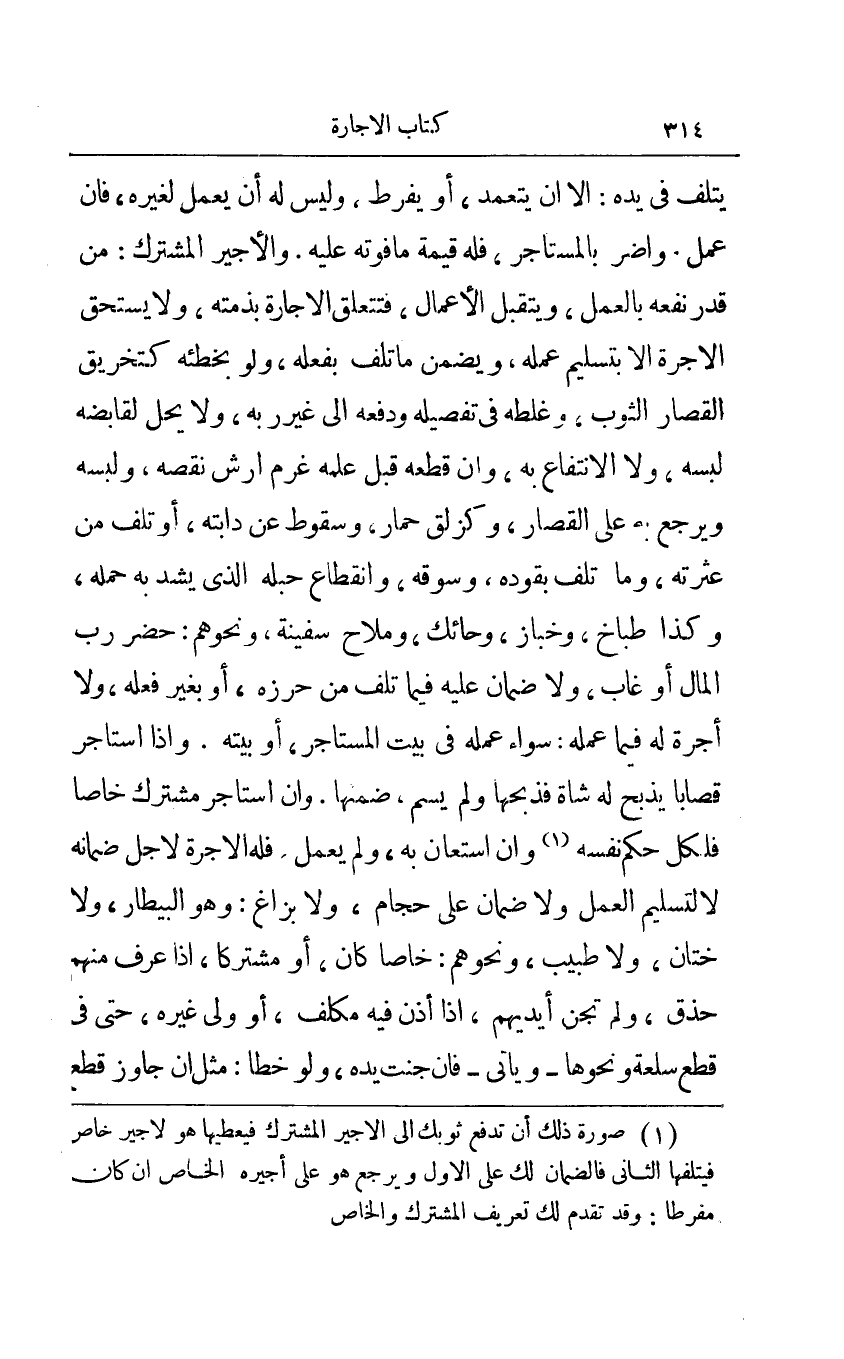 1 صورة ذلك أن تدفع ثوبك إلى الأجير المشترك فيعطيها هو لأجير خاص فيتلفها الثاني فالضمان لك على الأول ويرجع هو على أجيره الخاص إن كان مفرطا: وقد تقدم لك تعريف المشترك والخاص.