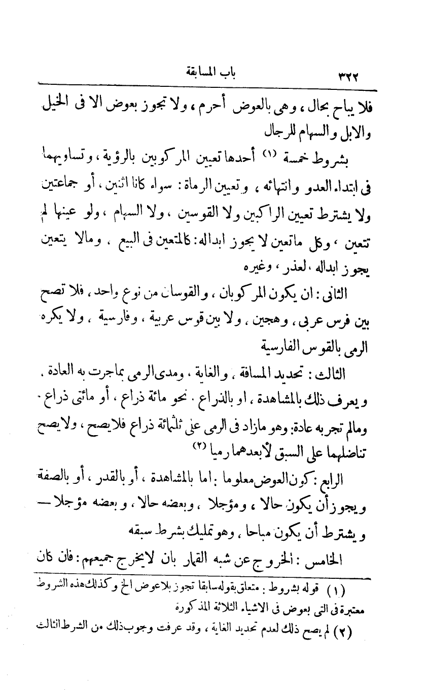 الثاني: أن يكون المركوبان والقوسان من نوع واحد فلا تصح بين فرس عربي وهجين ولا بين قوس عربية وفارسية ولا يكره الرمي بالقوس الفارسية.