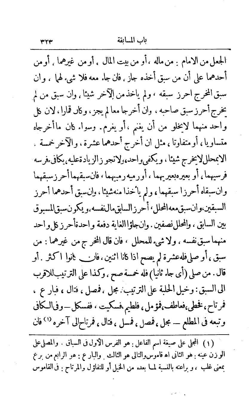 الجعل من الإمام: من ماله أو من بيت المال أو من غيرهما أو من أحدهما على أن من سبق أخذه جاز فإن جاء معه فلا شيء لهما وإن سبق المخرج أحرز سبقه ولم يأخذ الآخر شيئا وإن سبق من لم يخرج أحرز سبق صاحبه وإن أخرجا معا لم يجز وكان قمارا لأن كل واحد منهما لا يخلو من أن يغنم أو يغرم وسواء كان ما أخرجاه متساويا أو متفاوتا مثل أن أخرج أحدهما عشرة والآخر خمسة إلا بمحلل لا يخرج شيئا ويكفي واحد ولا تجوز الزيادة عليه يكافئ فرسه فرسيهما أو بعيريهما أو رميه رمييهما فإن سبقهما أحرز سبقهما وإن سبقاه أحرزا سبقهما ولم يأخذا منه شيئا وإن سبق أحدهما أحرز السبقين وإن سبق معه المحلل أحرز السابق مال نفسه ويكون سبق المسبوق بين السابق والمحلل نصفين وإن جاؤا الغاية دفعة واحدة أحرز كل واحد منهما سبق نفسه ولا شيء للمحلل فإن قال المخرج من غيرهما: من سبق أو صلى فله عشرة لم يصح إذا كانا اثنين فإن كانوا أكثر أو قال من صلى أي جاء ثانيا فله خمسة صح وكذا على الترتيب للأقرب إلى السبق: وخيل الحلبة على الترتيب: مجل فمصل فتال فبارع فمرتاح فخطى فعاطف فمؤمل فلطيم فسكيت ففسكل - وفي الكافي وتبعه في المطلع - مجل فمصل فمسل فتال فمرتاح إلى آخره1 فإن