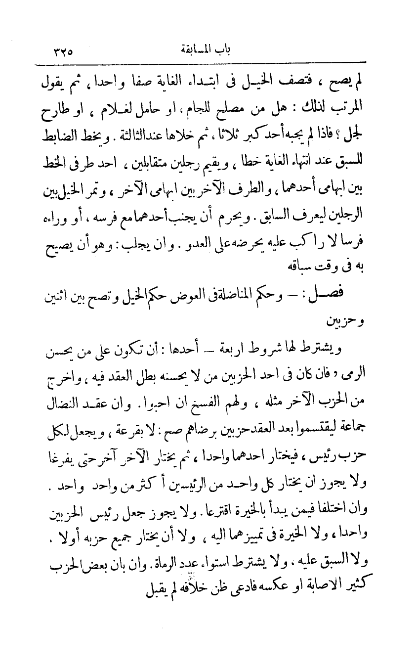 في العوض حكم الخيل وتصح بين اثنين وحزبين. ويشترط لها شروط أربعة - أحدها: أن تكون على من يحسن الرمي فإن كان في أحد الحزبين من لا يحسنه بطل العقد فيه وأخرج من الحزب الآخر مثله ولهم الفسخ أن أحبوا وإن عقد النضال جماعة ليقتسموا بعد العقد حزبين برضاهم صح: لا بقرعه ويجعل لكل حزب رئيس فيختار أحدهما واحدا ثم يختار الآخر آخر حتى يفرغا ولا يجوز أن يختار كل واحد الرئيسين أكثر من واحدهما واحد وإن اختلفا فيمن يبدأ بالخيرة اقترعا ولا يجوز جعل رئيس الحزبين واحدا ولا الخيرة في تمييزهما إليه ولا أن يختار جميع حزبه أولا ولا السبق عليه ولا يشترط استواء عدد الرماة وإن بان بعض الحزب كثير الإصابة أو عكسه فادعى ظن خلافه لم يقبل.