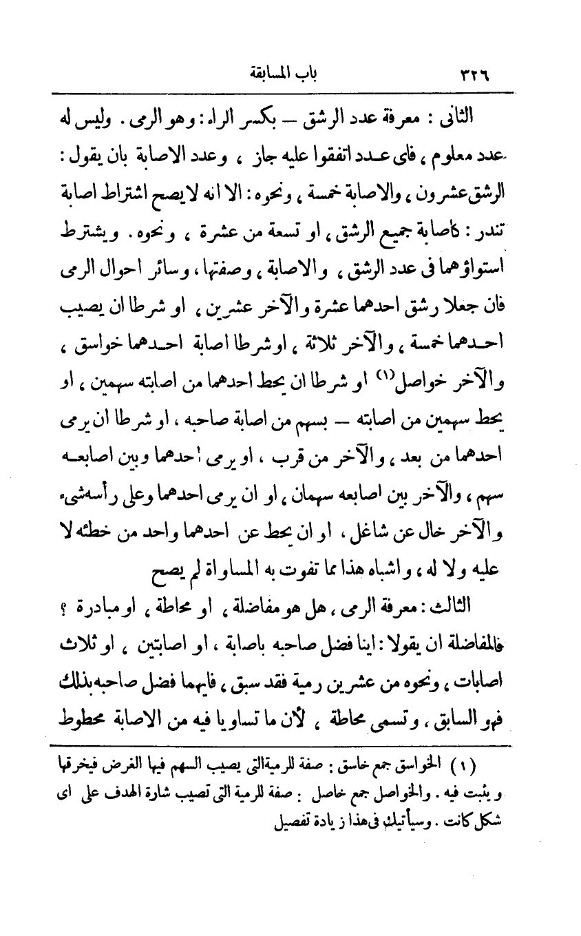 الثاني: معرفة عدد الرشق - بكسر الراء: وهو الرمي وليس له عدد معلوم فأي عدد اتفقوا عليه جاز وعدد الإصابة بان يقول: الرشق عشرون والإصابة خمسة ونحوه: إلا أنه لا يصح اشتراط إصابة تندر: كإصابة جميع الرشق أو تسعة من عشرة ونحوه ويشترط استواؤهما في عدد الرشق والإصابة وصفتها وسائر أحوال الرمي فإن جعلا رشق أحدهما عشرة والآخر عشرين أو شرطا أن يصيب أحدهما خمسة والآخر ثلاثة او شرطا إصابة أحدهما خواسق والآخر خواصل1 أو شرطا أن يحط أحدهما من إصابته سهمين أو يحط سهمين من إصابته - بسهم من إصابة صاحبه أو شرطا أن يرمي أحدهما من بعد والآخر من قرب أو يرمي أحدهما وبين أصابعه سهم والآخر بين أصابعه سهمان أو أن يرمي أحدهما على رأسه شيء والآخر خال عن شاغل أو أن يحط عن أحدهما واحد من خطئه لا عليه ولا له وأشباه هذا مما تفوت المساواة لم يصح.