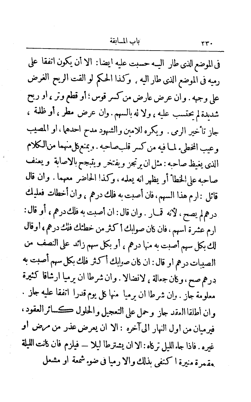 في الموضع الذي طار إليه حسبت عليه أيضا: إلا أن يكون اتفقا على رميه في الموضع الذي طار إليه وكذا الحكم لو ألقت الريح الغرض على وجهه وإن عرض عارض من كسر قوس أو قطع وتر أو ريح شديدة لم يحتسب عليه ولا له بالسهم وإن عرض مطر أو ظلمة جاز تأخير الرمي ويكره للامين والشهود مدح أحدهما أو المصيب وعيب المخطئ لما فيه من كسر قلب صاحبه ويمنع كل منهما من الكلام الذي يغيظ صاحبه: مثل أن يرتجز ويفتخر ويتبجح بالإصابة ويعنف صاحبه على الخطأ أو يظهر أنه يعلمه وكذا الحاضر معهما وإن قال قائل: ارم هذا السهم فإن أصبت به فلك درهم وإن أخطأت فعليك درهم لم يصح لأنه قمار وإن قال: أصبت به فلك درهم أو قال: ارم عشرة أسهم فإن كان صوابك أكثر من خطئك فلك درهم أو قال لك بكل سهم أصبت به منها درهم أو بكل سهم زائد على النصف من الصيبات درهم أو قال: إن كان صوابك أكثر فلك بكل سهم أصبت به درهم صح وكان جعالة لا نضالا وإن شرطا أن يرميا أرشاقا كثيرة معلومة جاز وإن شرطا أن يرميا منها كل يوم قدرا اتفقا عليه جاز وإن أطلقا العقد جاز وحمل على التعجيل والحلول كسائرة العقود فيرميان من أول النهار إلى آخره: إلا أن يعرض عذر من مرض أو غيره فإذا جاء الليل تركاه: إلا أن يشترطا ليلا - فيلزم فإن كانت الليلة مقمرة منيرة اكتفى وإلا رميا في ضوء شمعة أو مشعل.