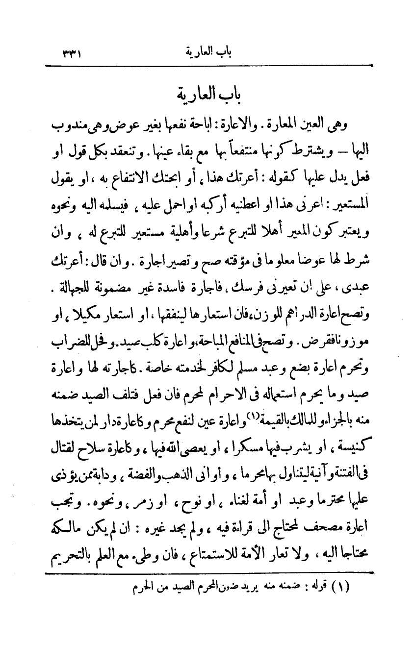 وهي العين المعارة والإعارة: إباحة نفعها بغير عوض وهي مندوب إليها - ويشترط كونها منتفعا بها مع بقاء عينها وتنعقد بكل قول أو فعل يدل عليها كقوله: أعرتك هذا أو أبحتك الانتفاع به أو يقول المستعير: أعرني هذا أو أعطنيه أركبه أو أحمل عليه فيسلمه إليه ونحوه ويعتبر كون المعير أهلا للتبرع شرعا وأهلية مستعير للتبرع له وإن شرطا لها عوضا معلوما في مؤقته صح وتصير إجارة وإن قال: أعرتك عبدي على أن تعيرني فرسك فإجارة فاسدة غير مضمونة للجهالة وتصح إعارة الدراهم للوزن فإن استعارها لينفقها أو استعار مكيلا أو موزونا فقرض وتصح في المنافع المباحة وإعارة كلب صيد وفحل للضراب وتحرم إعارة بضع وعبد مسلم لكافر لخدمته خاصة كإجارته لها وإعارة صيد وما يحرم استعماله في الإحرام لمحرم فإن فعل فتلف الصيد ضمنه منه بالجزاء وللمالك بالقيمة1 وإعارة عين لنفع محرم وكإعارة دار لمن يتخذها كنيسة أو يشرب فيها مسكرا أو يعصي الله فيها وكإعارة سلاح يؤذي عليها محترما وعبد أو أمه لغناء أو نوح أو زمر ونحوه وتجب إعارة مصحف لمحتاج إلى قراءة فيه ولم يجد غيره: إن لم يكن مالكه محتاجا إليه ولا تعار الأمة للاستمتاع فإن وطئ مع العلم بالتحريم