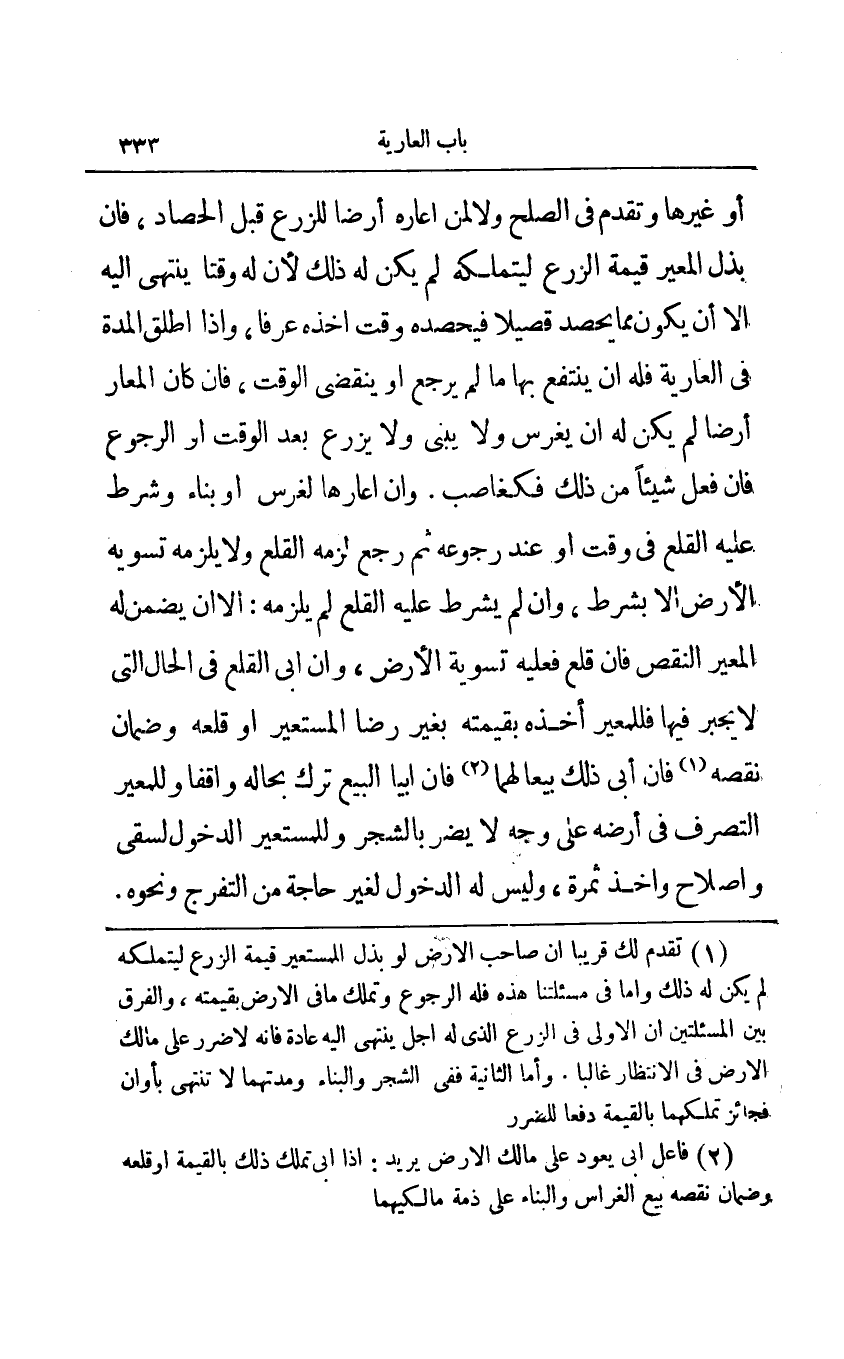 1 تقدم لك قريبا أن صاحب الأرض لو بذل المستعير قيمة الزرع ليتملكه لم يكن له ذلك وأما في مسألتنا هذه فله الرجوع وتملك ما في الأرض بقيمته، والفرق بين المسألتين أن الأولى في الزرع الذي له أجل ينتهي إليه عادة فإنه لا ضرر على مالك الأرض في الانتظار غالبا. وأما الثانية ففي الشجر والبناء ومدتهما لا تنتهي بأوان فجائز تملكها بالقيمة دفعا لضرر.
