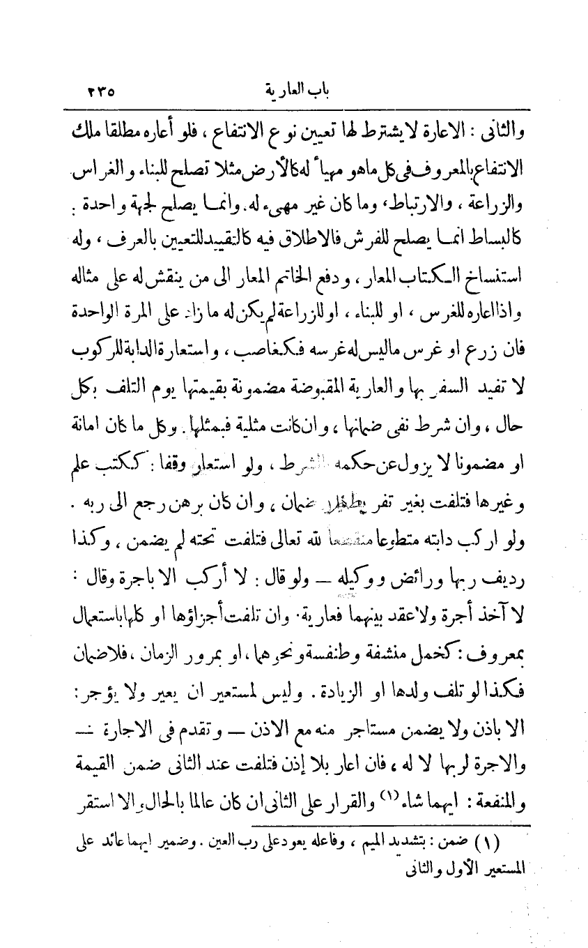 والثاني: الإعارة لا يشترط لها تعيين نوع الانتفاع فلو إعارة مطلقا ملك الانتفاع المعروف في كل ما هو مهيأ له كالأرض مثلا تصلح للبناء والغراس والزراعة والارتباط وما كان غير مهيء له وإنما يصلح لجهة واحدة: كالبساط إنما يصلح للفرش فالإطلاق فيه كالتقييد للتعيين بالعرف وله استنساخ الكتاب المعار ودفع الخاتم المعار إلى من ينقش له على مثاله وإذا إعارة للغرس أو للبناء أو للزراعة لم يكن له ما زاد على المرة الواحدة فإن زرع أو غرس ما ليس له غرسه فكغاصب واستعارة الدابة للركوب لا تفيد السفر بها والعارية المقبوضة مضمونة بقيمتها يوم التلف بكل حال وإن شرط نفي ضمانها وإن كانت مثلية فبمثلها وكل ما كان أمانة أو مضمونا لا يزول عن حكمه بالشرط ولو استعار وقفا: ككتب علم وغيرها فتلفت بغير تفريط فلا ضمان وإن كان برهن رجع إلى ربه ولو أركب دابته متطوعا منقطعا لله تعالى فتلفت تحته لم يضمن وكذا رديف ربها ورائض ووكيله - ولو قال: لا أركب إلا بأجرة وقال: لا آخذ أجرة ولا عقد بينهما فعارية وإن تلفت أجزاؤها أو كلها باستعمال بمعروف: كخمل منشفة وطنفسة ونحوهما أو بمرور الزمان فلا ضمان فكذا لو تلف ولدها أو الزيادة وليس لمستعير أن يعير ولا يؤجر: إلا بأذن ولا يضمن مستأجر منه مع الأذن - وتقدم في الإجارة - والأجرة لربها لا له فإن أعار بلا إذن فتلفت عند الثاني ضمن القيمة والمنفعة: أيهما شاء1 والقرار على الثاني إن كان عالما بالحال وإلا استقر