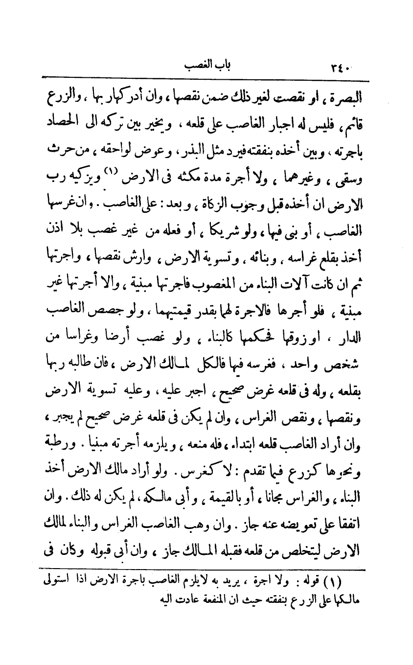 1 قوله: ولا أجرة، يريد به لا يلزم الغاصب بأجرة الأرض إذا استولى مالكها على الزرع بنفقته حيث أن المنفعة عادت إليه.