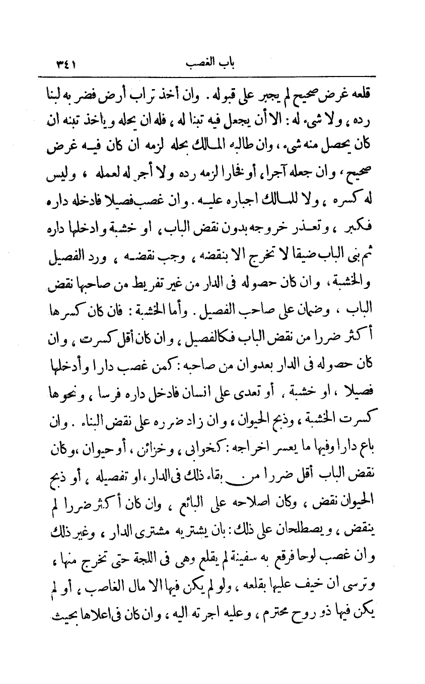 قلعه غرض صحيح لم يجبر على قبوله وإن أخذ تراب أرض فضربه به لبنا رده ولا شيء له: إلا أن يجعل فيه تبنا له فله أن يحله ويأخذ تبنه إن كان يحصل منه شيء وإن طالبه المالك بحله لزمه إن كان فيه غرض صحيح وإن جعله آجرا أو فخارا لزمه رده ولا أجر له لعمله وليس له كسره ولا المالك إجباره عليه وإن غصب فصيلا فأدخله داره فكبر وتعذر خروجه بدون نقض الباب أو خشبة وأدخلها داره ثم بنى الباب ضيقا لا تخرج إلا بنقضه وجب نقضه ورد الفصيل الخشبة وإن كان حصوله في الدار من غير تفريط من صاحبها نقض الباب وضمان على صاحب الفصيل وأما الخشبة: فإن كان كسرها أكثر ضررا من نقض الباب فكالفصيل وإن كان أقل كسرت وإن كان حصوله في الدار بعدو أن من صاحبه: كمن غصب دارا وأدخلها فصيلا أو خشبة أو تعدى على إنسان فأدخل داره فرسا ونحوها كسرت الخشبة وذبح الحيوان وإن زاد ضرره على نقض البناء وإن باع دارا وفيها ما يعسر أخراجه: كخوابي وخزائن أو حيوان وكان نقض الباب أقل ضررا من بقاء ذلك في الدار او تفصيله أو ذبح الحيوان نقض وكان إصلاحه على البائع وإن كان أكثر ضررا لم ينقض ويصطلحان على ذلك: بأن يشتريه مشتري الدار وغير ذلك وإن غصب لوحا فرقع به سفينة لم يقلع وهي في اللجة حتى تخرج منها وترسي أن خيف عليها بقلعه ولو لم يكن فيها إلا مال الغاصب أو لم يكن فيها ذو روح محترم وعليه أجرته إليه وإن كان في أعلاها بحيث
