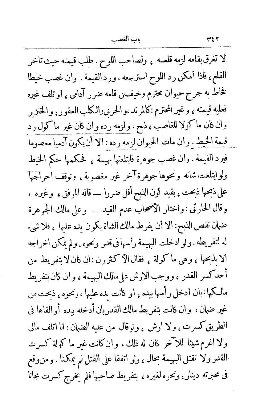 لا تغرق بقلعه لزمه قلعه ولصاحب اللوح طلب قيمته حيث تأخر القلع فإذا أمكن رد اللوح استرجعه ورد القيمة وإن غصب خيطا فخاط به جرح حيوان محترم وخيف قلعه ضرر آدامي أو تلف غيره فعليه قيمته وغير المحترم: كالمرتد والحربي والكلب العقور والخنزير وإن كان مأكولا للغاصب ذبح ولزمه رده وإن كان غير مأكول رد قيمة الخيط وإن مات الحيوان لزمه رده: إلا أن يكون آدميا معصوما فيرد القيمة وإن غصب جوهرة فابتلعتها بهيمة فحكمها حكم الخيط ولو ابتلعت شاته ونحوها جوهرة آخر غير مغصوبة وتوقف إخراجها على ذبحها ذبحت بقيد كون الذبح أقل ضررا - قاله الموفق وغيره وقال الحارثي: وأختار الأصحاب عدم القيد - وعلى مال الجوهرة ضمان نقص الذبح: إلا أن يفرط مالك الشاة بكون يده عليها فلا شيء له لتفريطه ولو أدخلت البهيمة رأسها في قدر ونحوه ولم يمكن إخراجه إلا بذبحها وهي مأكولة فقال الأكثرون إن كان لا بتفريط من أحد كسر القدر ووجب الأرش على مالك البهيمة وإن كان بتفريط مالكها بأن أدخل رأسها بيده أو كانت يده عليها ونحوه ذبحت من غير ضمان وإن كانت بتفريط مالك القدر بأن أدخله بيده أو ألقاها في الطريق كسرت ولا أرش ولو قال من عليه الضمان: أنا أتلف مالي ولا أغرم شيئا للآخر كان له ذلك وإن كانت غير مأكولة كسرت القدر ولا تقتل البهيمة بحال ولو اتفقا على القتل لم يمكنا ومن وقع في محبرته دينار ونحوه لغيره بتفريط صاحبها فلم يخرج كسرت مجانا