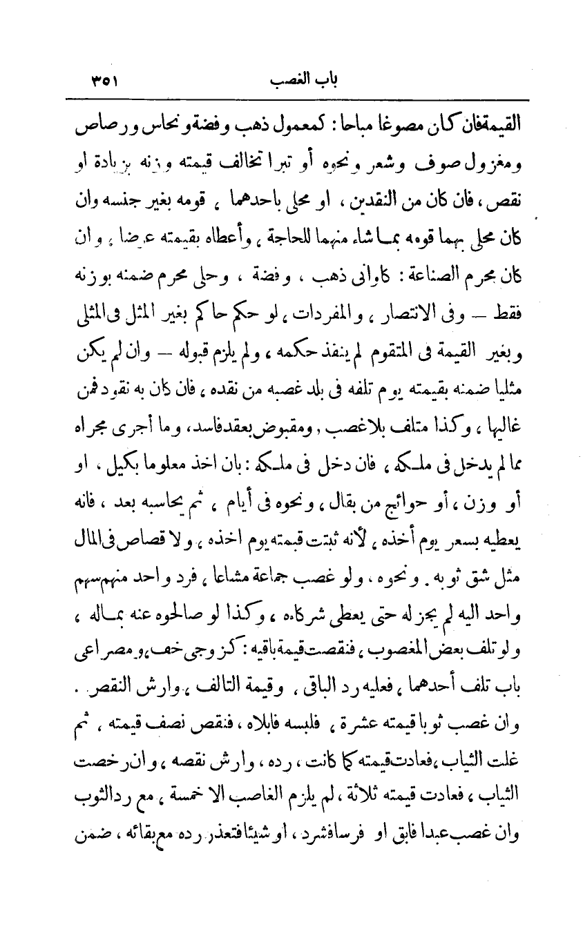 القيمة فإن كان مصوغا مباحا: كمعمول ذهب وفضة ونحاس ورصاص ومغزول صوف وشعر ونحوه أو تبرا تخالف قيمته وزنه بزيادة أو نقص فإن كان من النقدين أو محلى بأحدهما قومه بغير جنسه وإن كان محلى بهما قومه بما شاء منهما للحاجة وأعطاه بقيمته عرضا وإن كان محرم الصناعة: كأواني ذهب وفضة وحلي محرم ضمنه بوزنه فقط - وفي الانتصار والمفردات لو حكم حاكم بغير المثل في المثلى وبغير القيمة في المتقوم لم ينفذ حكمه ولم يلزم قبوله - وإن لم يكن مثليا ضمنه بقيمته يوم تلفه في بلد غصبنه من نقده فإن كان به نقود فمن غاليها وكذا متلف بلا غصب ومقبوض بعقد فاسد وما أجرى مجراه مما لم يدخل في ملكه فإن دخل في ملكه بأن أخذ معلوما بكيل أو وزن أو حوائج من بقال ونحوه في أيام ثم يحاسبه بعد فإنه يعطيه بسعر يوم أخذه لأنه ثبتت قيمته يوم أخذه ولا قصاص في المال مثل شق ثوبه ونحوه ولو غصب جماعة مشاعا فرد واحد منهم سهم واحد أليه لم يجز له حتى يعطي شركاءه وكذا لو صالحوه عنه بماله ولو تلف بعض المغصوب فنقصت قيمة باقية: كزوجي خف ومصراعي باب تلف أحدهما فعليه رد الباقي وقيمة التالف وأرش النقص وإن غصب ثوبا قيمته عشرة فلبسه فأبلاه فنقص نصف قيمته ثم غلت الثياب فعادت قيمته كما كانت رده وأرش نقصه وإن رخصت الثياب فعادت قيمته ثلاثة لم يلزم الغاصب إلا خمسة مع رد الثوب وإن غصب عبدا فابق أو فرسا فشرد أو شيئا فتعذر رده مع بقائه ضمن