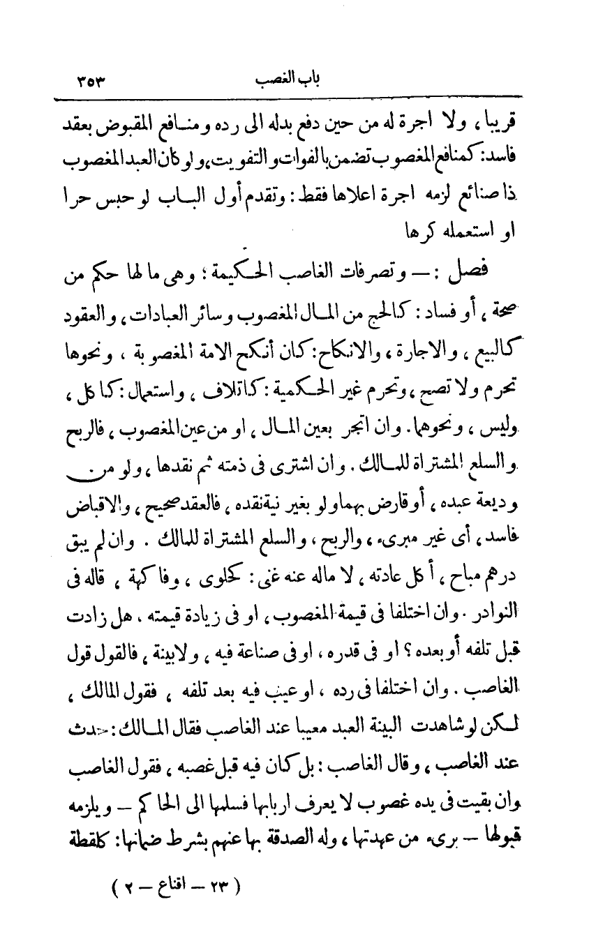 وهي ما لها حكم من صحة أو فساد: كالحج من المال المغصوب وسائر العبادات والعقود كالبيع والإجارة والانكاح: كان أنكح الأمة المغصوبة ونحوها تحرم ولا تصح وتحرم غير الحكمية: كإتلاف واستعمال: كأكل وليس ونحوهما وإن اتجر بعين المال أو من عين المغصوب فالريح والسلع المشتراة للمالك وإن اشترى في ذمته ثم نقدها ولو من وديعة عبده أو قارض بهما ولو بغير نية نقده فالنقد صحيح والاقباض فاسد أي غير مبرئ الربح والسلح المشتراة للمالك وإن لم يبق درهم مباح أكل عادته لا ماله عنه غنى: كحلوى وفاكهة وقاله في النوادر وإن اختلفا في قيمة المغصوب أو في زيادة قيمته هل زادت قبل تلفه أو بعده؟ أو في قدره او في صناعة فيه ولا بينة فالقول قول الغاصب وإن اختلفا في رده أو عيب فيه بعد تلفه فقول المالك لكن لو شاهدت البينة العبد معيبا عند الغاصب فقال المالك: حدث عند الغاصب وقال الغاصب: بل كان فيه قبل غصبه فقول الغاصب وإن بقيت في يده غصوب لا يعرف أربابها فسلمها إلى الحاكم - ويلزمه قبولها - برئ من عهدتها وله الصدقة بها عنهم بشرط ضمانها: كلقطة