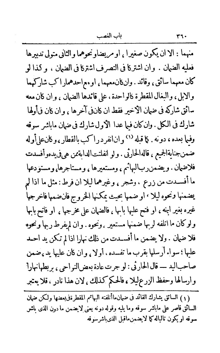 1 السائق يشارك القائد في ضمان ما أتلفته البهائم المقطرة في بعضها ولكن ضمان السائق قاصر على ما باشر سوقه وما يليه وقوله: دونه يعني لا يضمن ما دون الذي باشر سوقه أو يكون تاليا له كما لا يضمن ما قبل الذي باشر سوقه.