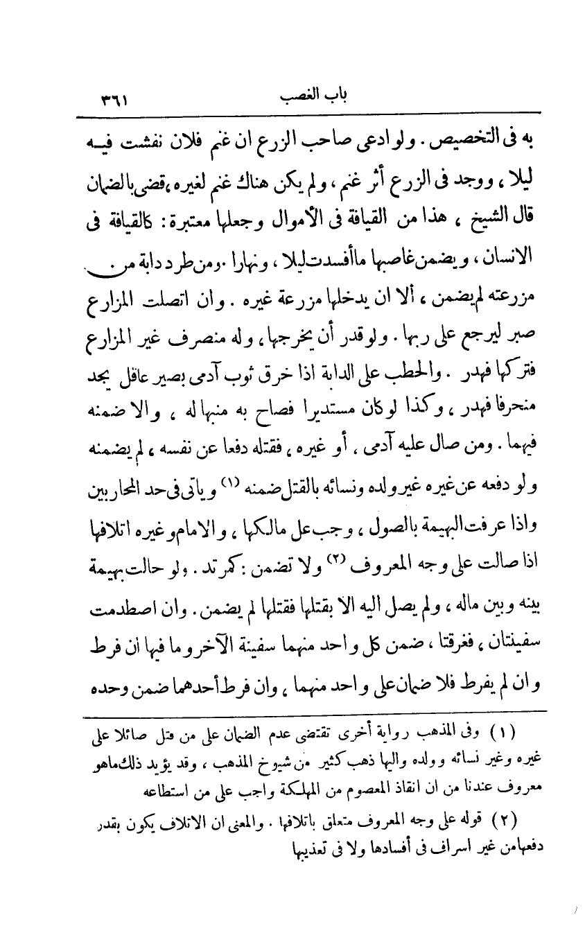 به في التخصيص ولو أدعى صاحب الزرع أن غنم فلان نفشت فيه ليلا ووجد الزرع أثر غنم ولم يكن هناك غنم لغيره قضي بالضمان قال الشيخ: هذا من القيافة في الأموال وجعلها معتبرة: كالقيافة في الإنسان ويضمن غاصبها ما أفسدت ليلا ونهارا ومن طرد دابة من مزرعته لم يضمن إلا أن يدخلها مزرعة غيره وإن اتصلت المزارع صبر ليرجع على ربها ولو قدر أن يخرجها وله منصرف غير المزارع فتركها فهدر والحطب على الدابة إذا خرق ثوب آدمي بصير عاقل يجد منحرفا فهدر وكذا لو كان مستديرا فصاح به منبها له وإلا ضمنه فيهما ومن صال عليه آدمي أو غيره فقتله دفعا عن نفسه، لم يضمنه ولو دفعه عن غير ولده ونسائه بالقتل ضمنه1 ويأتي في حد المحاربين وإذا عرفت البهيمة بالصول وجب على مالكها والإمام وغيره إتلافها إذا صالت على وجه المعروف2 ولا تضمن: كمرتد ولو حالت بهيمة بينه وبين ماله ولم يصل إليه إلا بقتلها فقتلها لم يضمن وإن اصطدمت سفينتان فغرقتا ضمن كل واحد منهما سفينة الآخر ما فيها إن فرط وإن لم يفرط فلا ضمان على واحد منهما وإن فرط أحدهما ضمن وحده